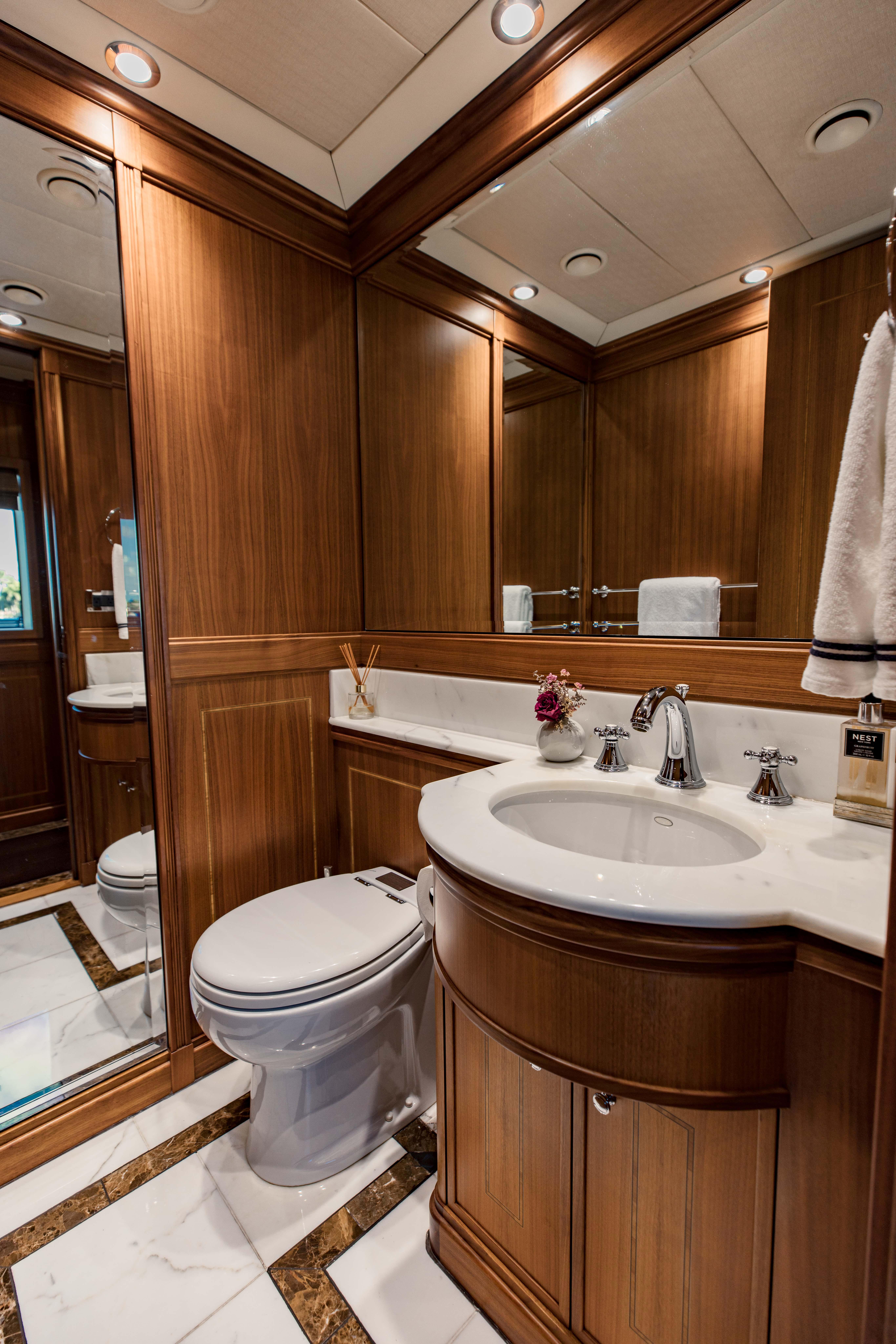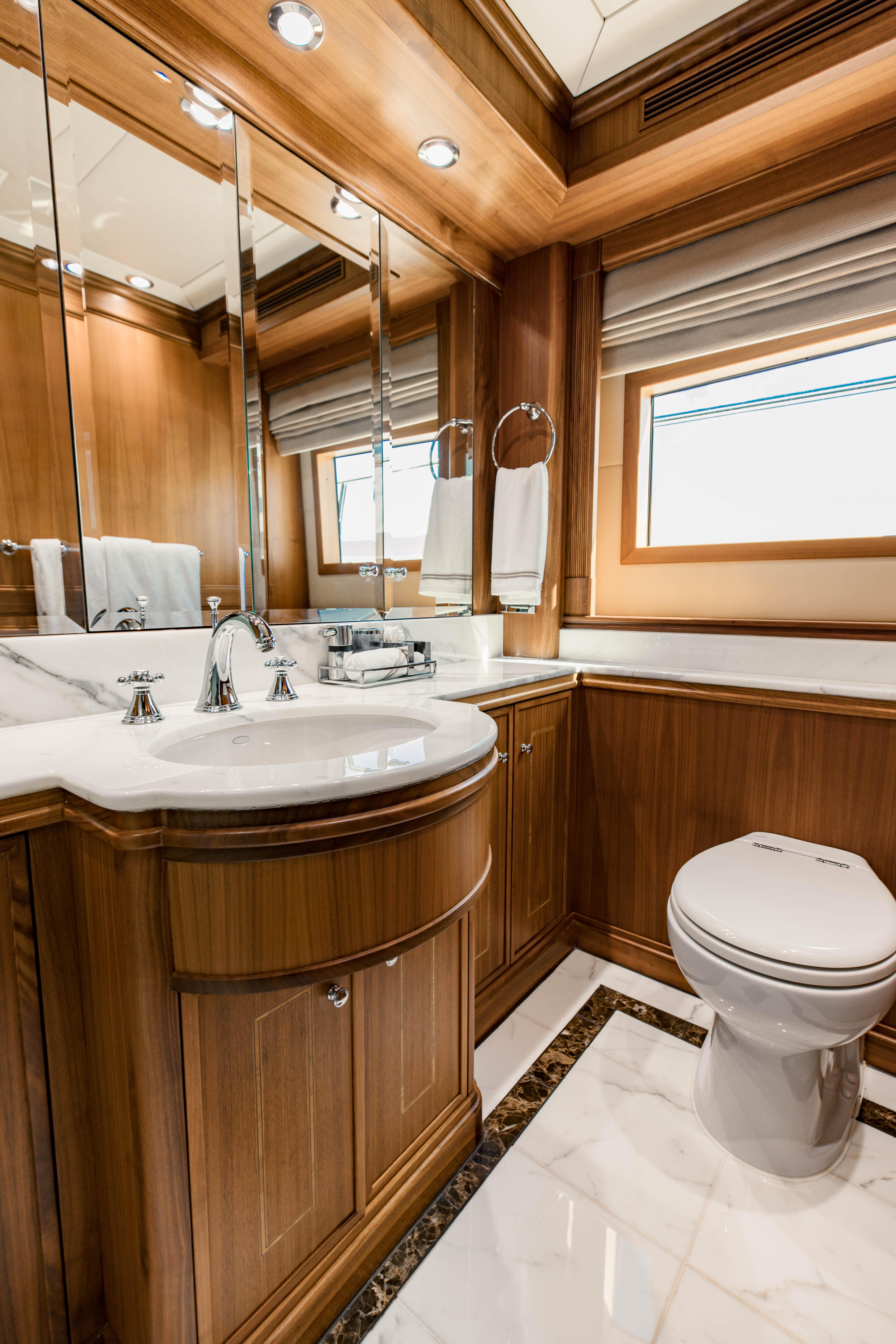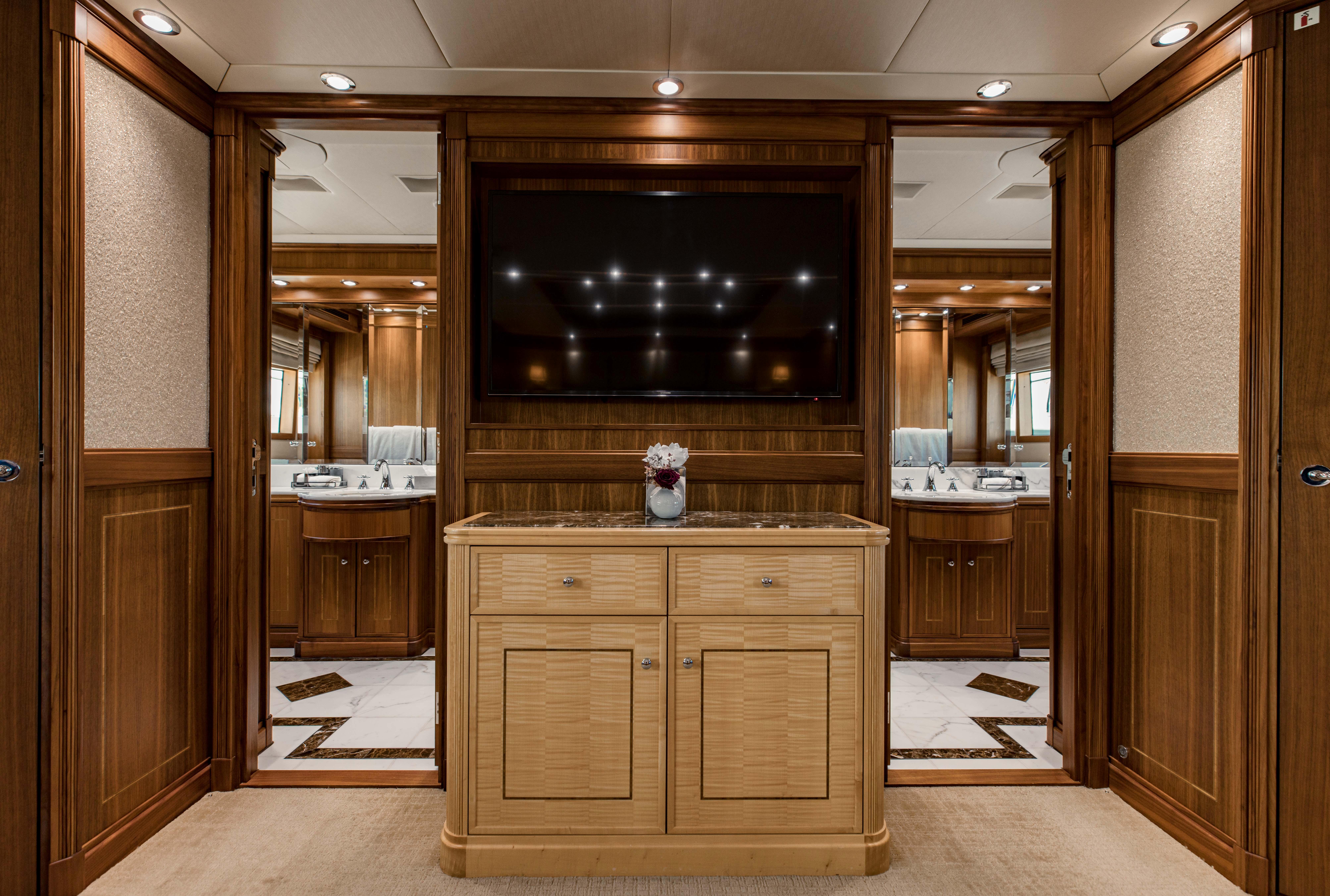 Vessel DescriptionMAIN DECK Aft Deck This open deck has an inlaid teak oval dining table that comfortably seats ten. There is a full-service bar with four polished chrome barstools that are forward to port with an adjacent staircase to the fly bridge. There are two staircases down either side to the spacious opening swim platform. Additional Aft Deck Details: Varnished, inlaid teak dining table (5) teak deck chairs Teak deck (new 2017) Teak stairwell to sun deck Complete covers for all seating and bars (2) cushioned built-in settees Carrara Crema marble topped bar with a copper sink Bar height countertop in varnished teak (4) polished chrome barstools Perlick ice maker Perlick refrigerator 65” Samsung Smart TV (4) 6” recessed speakers LED lighting in the overhead Large bosuns locker to starboard Aft Deck Equipment Opening swim platform Stainless steel air actuated sliding door to salon Sanguineti Passarelle Marquipt side boarding ladder Starboard side storage locker with water tight door (2) Maxwell 4000 deck winches Main Salon The main salon is a bright and generous open space with a very relaxed yet elegant décor. Couches, easy chairs, and coffee tables compliment this area. Roman blinds and silhouette shades provide privacy, and Lutron lighting provides many programmable settings for light control, all new LED lighting. The main salon has an audio-visual Crestron entertainment system complete with surround sound for your movie enjoyment. Electric powered stainless steel and glass doors access the open aft deck. American walnut flooring. Additional Main Salon Details: Wide body full beam salon American walnut flooring Preferred matte finish mahogany wood paneling Recessed accent ceiling décor above salon and dining areas Updated headliner throughout salon and dining areas All A/C vented through fluted valances Large storage area, salon port side Privacy curtain for salon door L-shaped couch with (7) throw pillows Teak cocktail table (2) casual chairs Air Handlers – (1) port (new 2019) and (1) stbd (new 2023) Main Salon A/V 55” Samsung LED TV with surround sound DIRECTV® – Satellite TV Apple TV Google Chromecast Denon AMP (6) speakers & subwoofer Lutron lighting control Creston control system Main salon and foyer: Speakers installed new 2021 Dining Room The dining area is forward and open to the main salon. The table is designed to seat eight guests comfortably. The day head, located on the main deck adjacent to the main deck foyer, is finished in Portoro and Thassos marbles. American walnut hardwood flooring. Additional Dining Room Details High-gloss inlaid dining table with seating for (8) – refinished 2019 (8) chairs – repaced 2024 Day head featuring: Tecma head, wash basin with marble top, Grohe faucet and widespread fixtures with chrome finish Air handler (new 2018) Galley The galley is forward to port of the dining room on the main deck. Serving pantry is outboard and aft to port with access to the main deck dining room. The galley and pantry area is complete with all the necessary amenities i.e., freezers, refrigerators, cook tops, ice makers, and storage. All appliances and cabinetry have been updated. Additional Galley Details Wolf induction cooktop (replaced 2021) (2) Subzero refrigerator / freezer storage drawers (1) Subzero refrigerator – floor to ceiling (1) Subzero freezer – floor to ceiling (2) Wolf steam ovens (installed new 2020) Miele professional dishwasher Extractor hood (new 2019) Microwave (2) Double S/S sinks Garbage disposal Crema marble countertops Master Stateroom The master stateroom is on the main deck forward with a king size bed, storage beneath and an upholstered headboard. Two nightstands on either side have Onyx tops, each with a pullout drawer and lower storage. To starboard is a desk and vanity with two sets of drawers and a small table with chair to port. Entertainment center with media storage is centerline forward. His and hers cedar lined walk-in closets. There are sconces and a Lutron lighting control system. A/V system, Blu-ray, DVD, DIRECTV. Additional Master Stateroom Details Updated headliner throughout Electric shades / silhouettes Lutron LED lighting controls King size bed with storage (2) Onyx top nightstands Desk with vanity (2) Cedar lined his and hers closets His and her Tecma heads with joint master shower on centerline Wash basin with marble top Grohe faucet and widespread fixtures with chrome finish Calacatta Vagli Oro marble on floors and vanities All mirrors replaced in 2022 Master Stateroom A/V 50” Samsung Smart TV Apple TV Google Chromecast Blu-ray and DVD Speakers installed new 2021 LOWER DECK Lower Companionway Step down into the beautiful companionway, featuring American walnut flooring and a large breakfast bar. The bar features a marble top, as well as hand crafted cabinets with abundant storage. Included is a Samsung washer and separate Samsung dryer. Additional Lower Companionway Details American walnut flooring with marble inlay Large breakfast bar with marble top Hand crafted cabinets with teak inlay Abundant linen and drawer storage Samsung oversized washer Samsung oversized dryer Updated headliner with LED lighting Guest Staterooms Port and Starboard Guest Staterooms Two matching guest staterooms are forward to port and starboard. Each room is finished with updated headliner throughout, upholstered headboards and marble topped nightstands on either side of beds. Each stateroom has its own marble finished bathroom with ensuite head and shower, Samsung Smart TV and sound system, and upgraded LED lighting. Additional Guest Stateroom Details Queen size pedestal bed with (4) storage drawers (2) Nightstands with marble tops (2) Wall sconces Cedar lined wardrobe Cabinet with marble top Porthole Cascading air conditioning Ensuite head and shower Tecma head Wash basin with marble top Grohe faucet and widespread fixtures with chrome finish Storage cabinet Head and shower feature Calacatta marble flooring wi