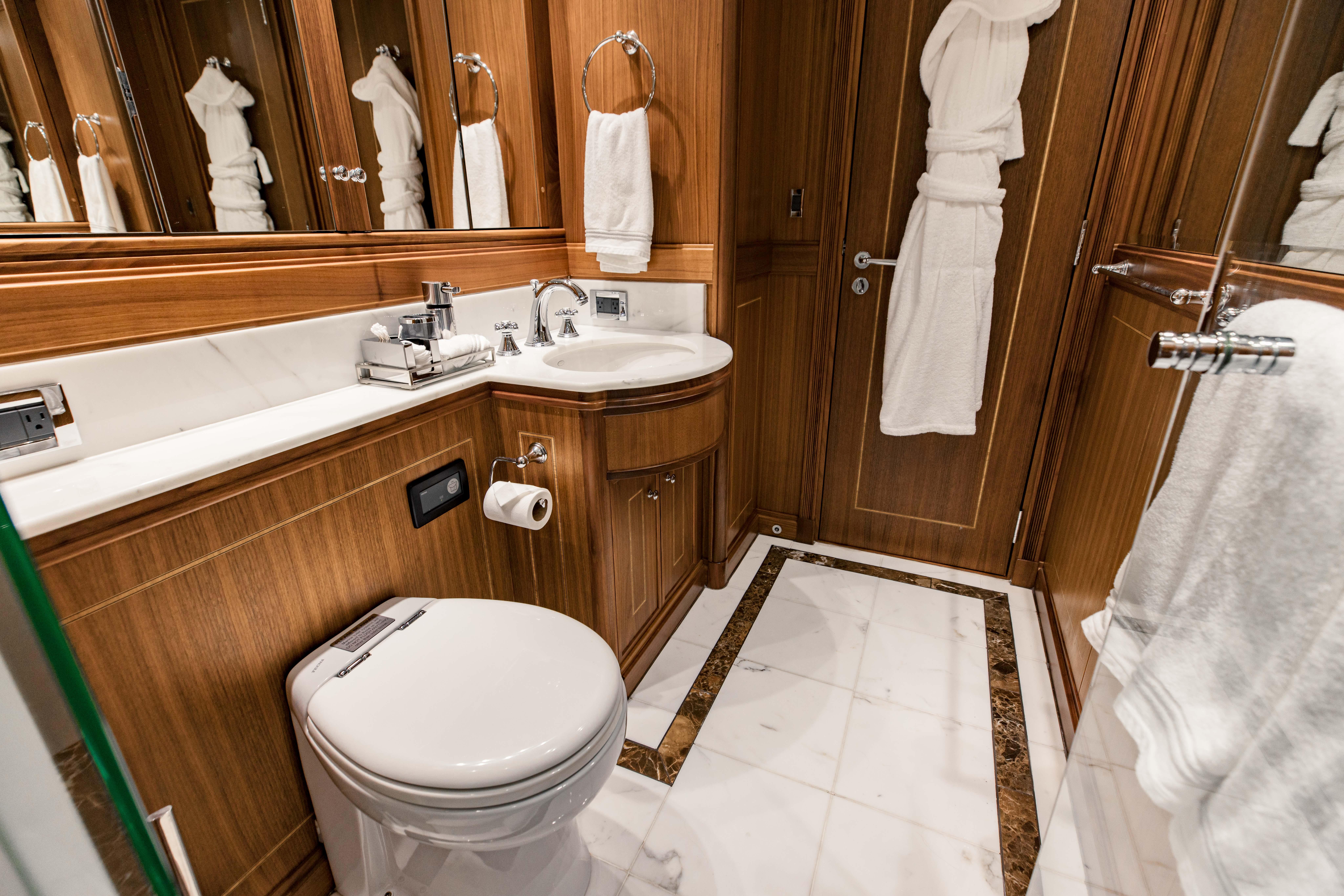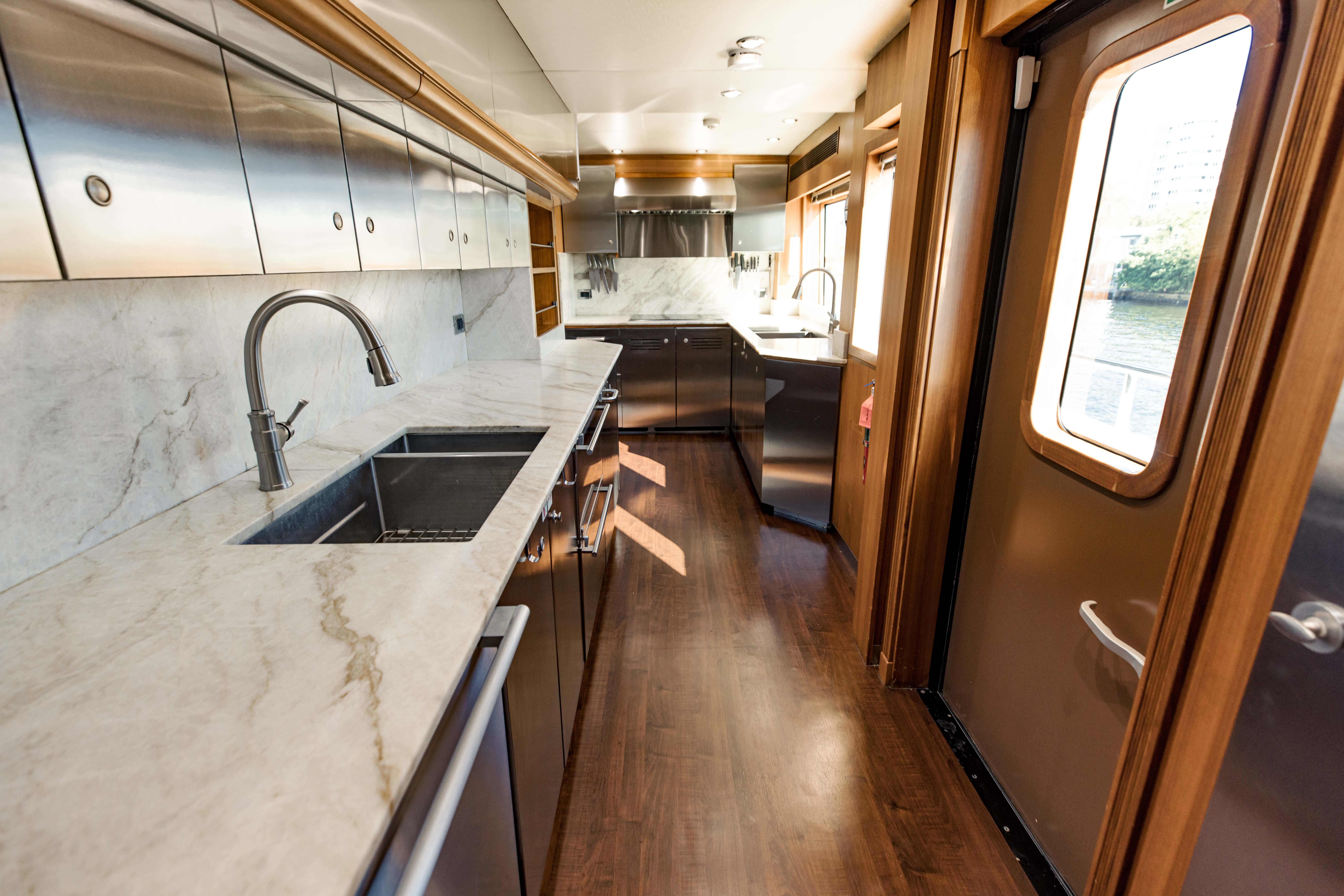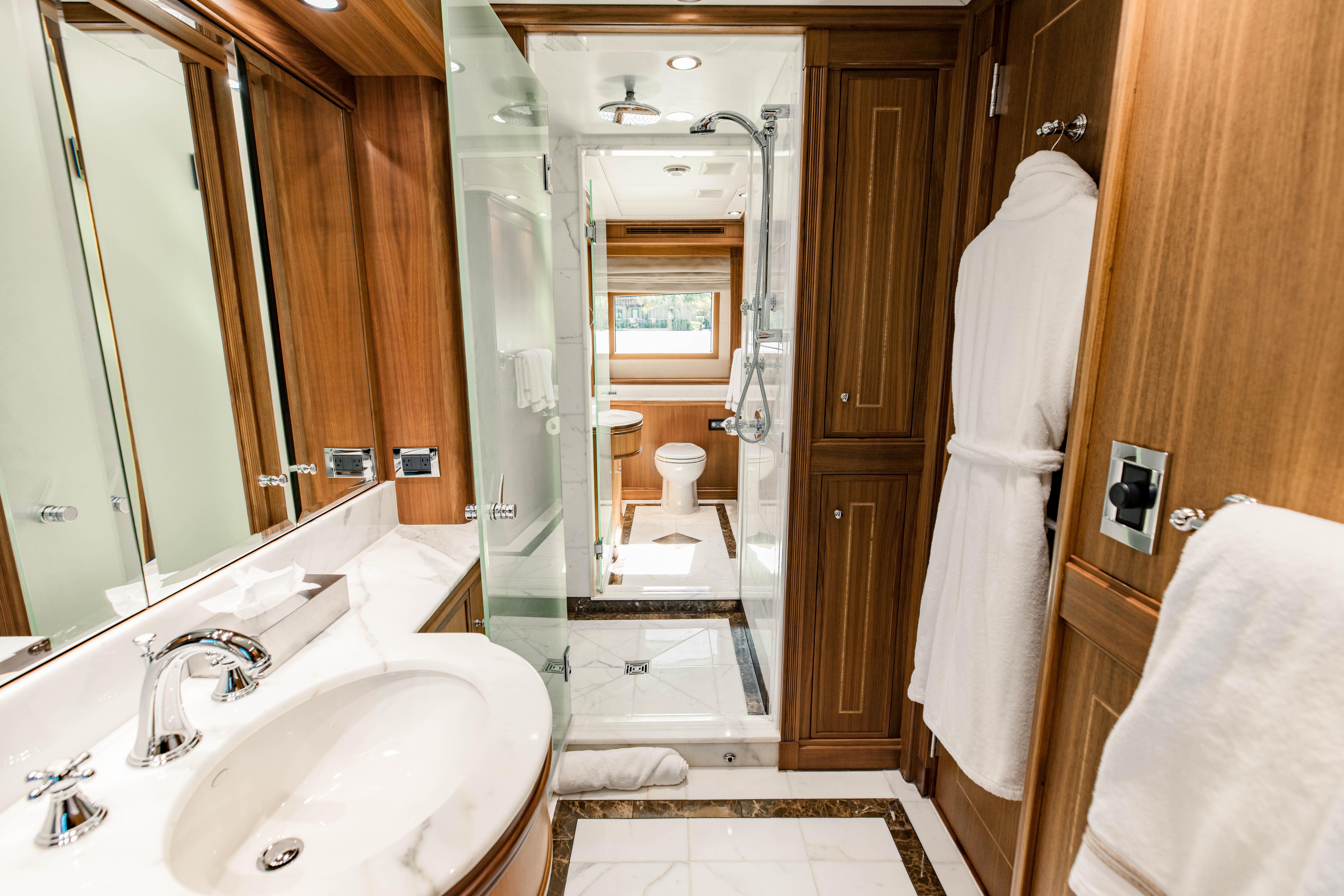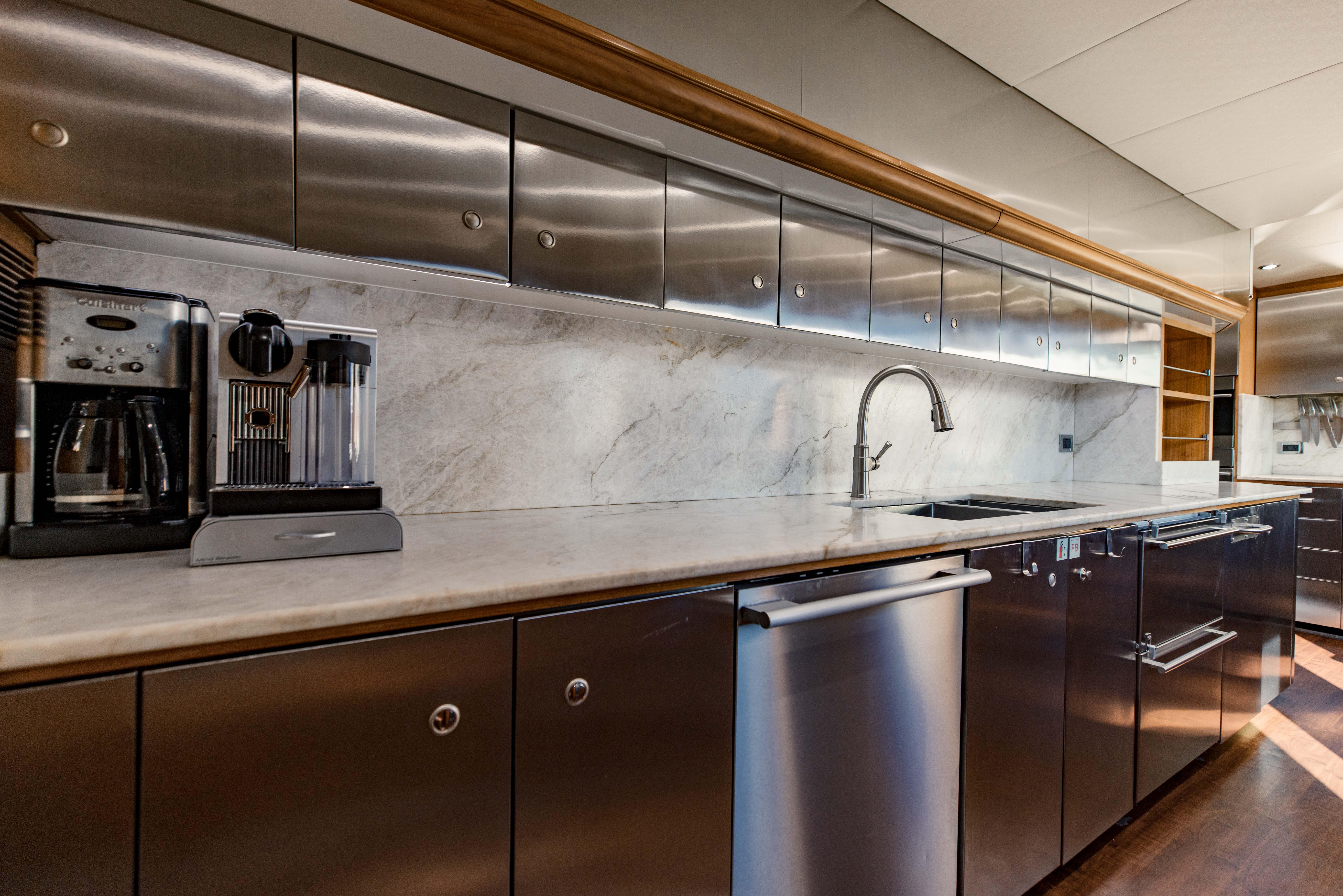 Vessel DescriptionMAIN DECK Aft Deck This open deck has an inlaid teak oval dining table that comfortably seats ten. There is a full-service bar with four polished chrome barstools that are forward to port with an adjacent staircase to the fly bridge. There are two staircases down either side to the spacious opening swim platform. Additional Aft Deck Details: Varnished, inlaid teak dining table (5) teak deck chairs Teak deck (new 2017) Teak stairwell to sun deck Complete covers for all seating and bars (2) cushioned built-in settees Carrara Crema marble topped bar with a copper sink Bar height countertop in varnished teak (4) polished chrome barstools Perlick ice maker Perlick refrigerator 65” Samsung Smart TV (4) 6” recessed speakers LED lighting in the overhead Large bosuns locker to starboard Aft Deck Equipment Opening swim platform Stainless steel air actuated sliding door to salon Sanguineti Passarelle Marquipt side boarding ladder Starboard side storage locker with water tight door (2) Maxwell 4000 deck winches Main Salon The main salon is a bright and generous open space with a very relaxed yet elegant décor. Couches, easy chairs, and coffee tables compliment this area. Roman blinds and silhouette shades provide privacy, and Lutron lighting provides many programmable settings for light control, all new LED lighting. The main salon has an audio-visual Crestron entertainment system complete with surround sound for your movie enjoyment. Electric powered stainless steel and glass doors access the open aft deck. American walnut flooring. Additional Main Salon Details: Wide body full beam salon American walnut flooring Preferred matte finish mahogany wood paneling Recessed accent ceiling décor above salon and dining areas Updated headliner throughout salon and dining areas All A/C vented through fluted valances Large storage area, salon port side Privacy curtain for salon door L-shaped couch with (7) throw pillows Teak cocktail table (2) casual chairs Air Handlers – (1) port (new 2019) and (1) stbd (new 2023) Main Salon A/V 55” Samsung LED TV with surround sound DIRECTV® – Satellite TV Apple TV Google Chromecast Denon AMP (6) speakers & subwoofer Lutron lighting control Creston control system Main salon and foyer: Speakers installed new 2021 Dining Room The dining area is forward and open to the main salon. The table is designed to seat eight guests comfortably. The day head, located on the main deck adjacent to the main deck foyer, is finished in Portoro and Thassos marbles. American walnut hardwood flooring. Additional Dining Room Details High-gloss inlaid dining table with seating for (8) – refinished 2019 (8) chairs – repaced 2024 Day head featuring: Tecma head, wash basin with marble top, Grohe faucet and widespread fixtures with chrome finish Air handler (new 2018) Galley The galley is forward to port of the dining room on the main deck. Serving pantry is outboard and aft to port with access to the main deck dining room. The galley and pantry area is complete with all the necessary amenities i.e., freezers, refrigerators, cook tops, ice makers, and storage. All appliances and cabinetry have been updated. Additional Galley Details Wolf induction cooktop (replaced 2021) (2) Subzero refrigerator / freezer storage drawers (1) Subzero refrigerator – floor to ceiling (1) Subzero freezer – floor to ceiling (2) Wolf steam ovens (installed new 2020) Miele professional dishwasher Extractor hood (new 2019) Microwave (2) Double S/S sinks Garbage disposal Crema marble countertops Master Stateroom The master stateroom is on the main deck forward with a king size bed, storage beneath and an upholstered headboard. Two nightstands on either side have Onyx tops, each with a pullout drawer and lower storage. To starboard is a desk and vanity with two sets of drawers and a small table with chair to port. Entertainment center with media storage is centerline forward. His and hers cedar lined walk-in closets. There are sconces and a Lutron lighting control system. A/V system, Blu-ray, DVD, DIRECTV. Additional Master Stateroom Details Updated headliner throughout Electric shades / silhouettes Lutron LED lighting controls King size bed with storage (2) Onyx top nightstands Desk with vanity (2) Cedar lined his and hers closets His and her Tecma heads with joint master shower on centerline Wash basin with marble top Grohe faucet and widespread fixtures with chrome finish Calacatta Vagli Oro marble on floors and vanities All mirrors replaced in 2022 Master Stateroom A/V 50” Samsung Smart TV Apple TV Google Chromecast Blu-ray and DVD Speakers installed new 2021 LOWER DECK Lower Companionway Step down into the beautiful companionway, featuring American walnut flooring and a large breakfast bar. The bar features a marble top, as well as hand crafted cabinets with abundant storage. Included is a Samsung washer and separate Samsung dryer. Additional Lower Companionway Details American walnut flooring with marble inlay Large breakfast bar with marble top Hand crafted cabinets with teak inlay Abundant linen and drawer storage Samsung oversized washer Samsung oversized dryer Updated headliner with LED lighting Guest Staterooms Port and Starboard Guest Staterooms Two matching guest staterooms are forward to port and starboard. Each room is finished with updated headliner throughout, upholstered headboards and marble topped nightstands on either side of beds. Each stateroom has its own marble finished bathroom with ensuite head and shower, Samsung Smart TV and sound system, and upgraded LED lighting. Additional Guest Stateroom Details Queen size pedestal bed with (4) storage drawers (2) Nightstands with marble tops (2) Wall sconces Cedar lined wardrobe Cabinet with marble top Porthole Cascading air conditioning Ensuite head and shower Tecma head Wash basin with marble top Grohe faucet and widespread fixtures with chrome finish Storage cabinet Head and shower feature Calacatta marble flooring wi