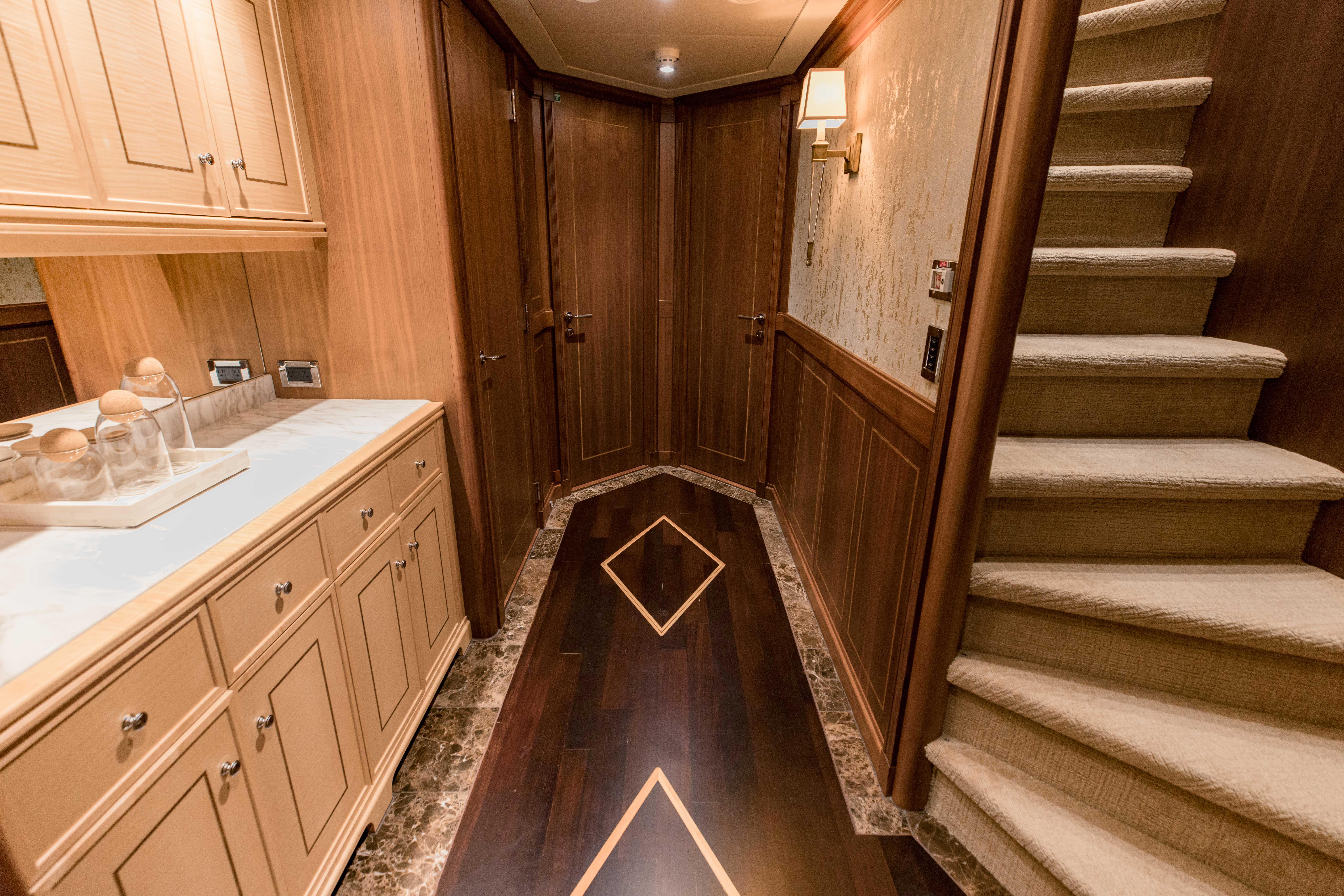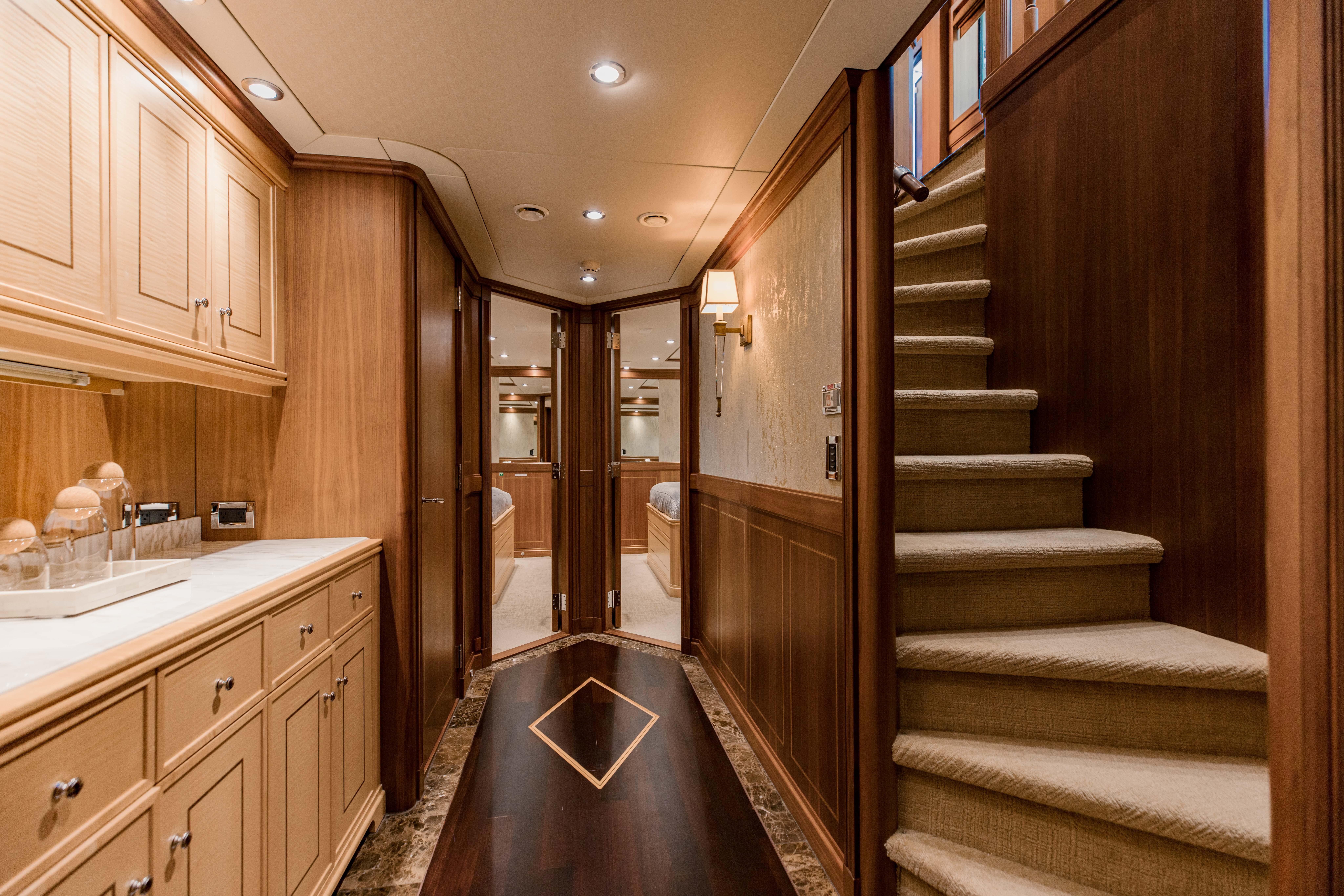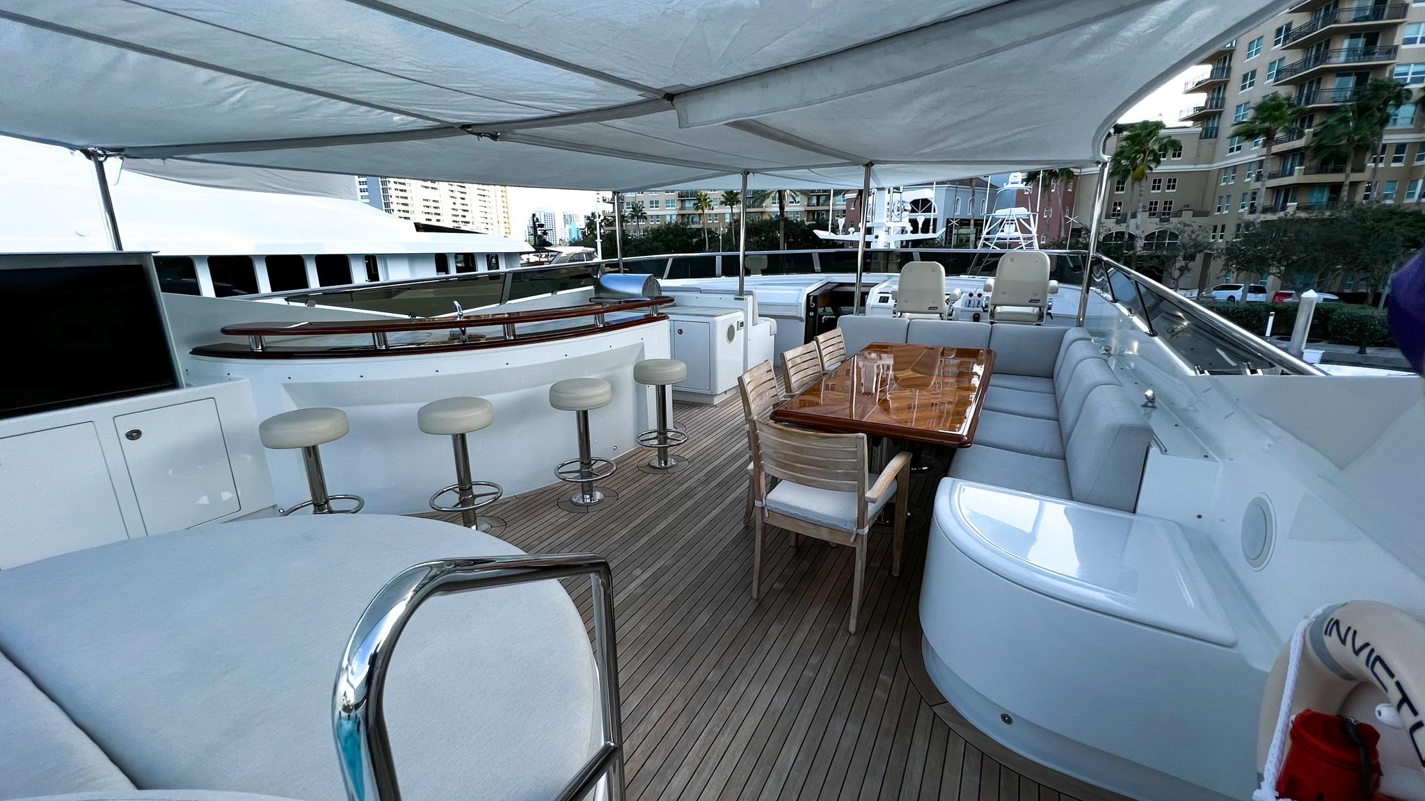 The dual-purpose aft deck of this yacht is a standout feature, offering both leisure and practical functions. It includes a swim platform for easy access to the water, ideal for swimming or launching water toys. This versatile space is perfect for socializing, relaxing, or deploying recreational equipment, making it a valuable area for yacht owners and guests.