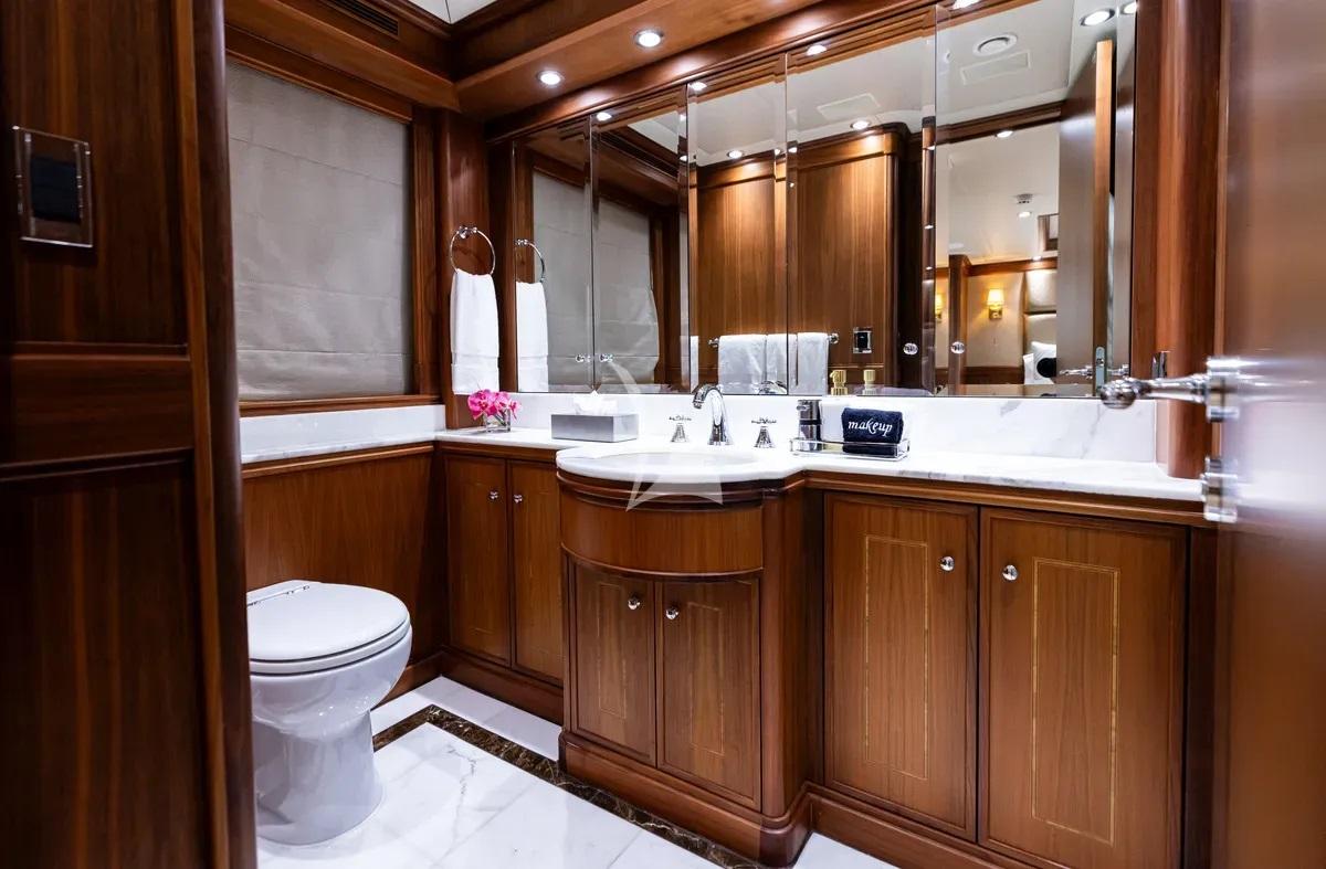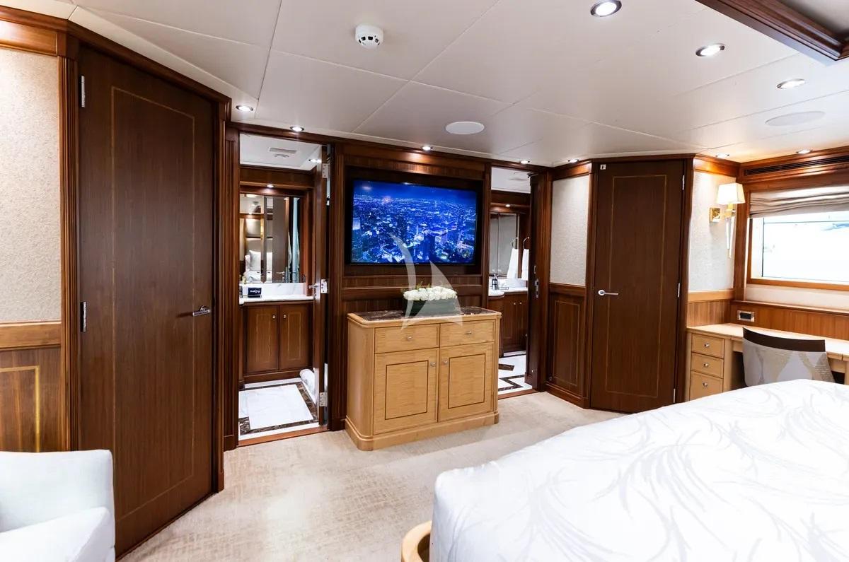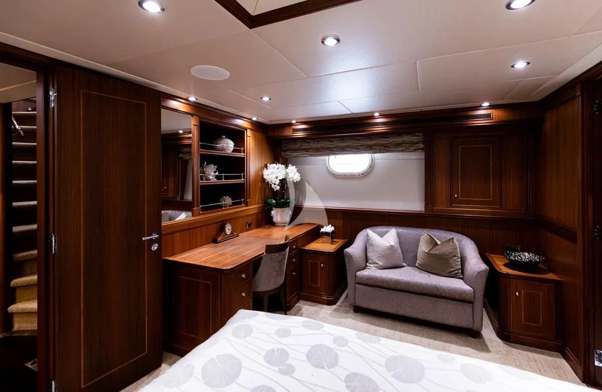 The dual-purpose aft deck of this yacht is a standout feature, offering both leisure and practical functions. It includes a swim platform for easy access to the water, ideal for swimming or launching water toys. This versatile space is perfect for socializing, relaxing, or deploying recreational equipment, making it a valuable area for yacht owners and guests.