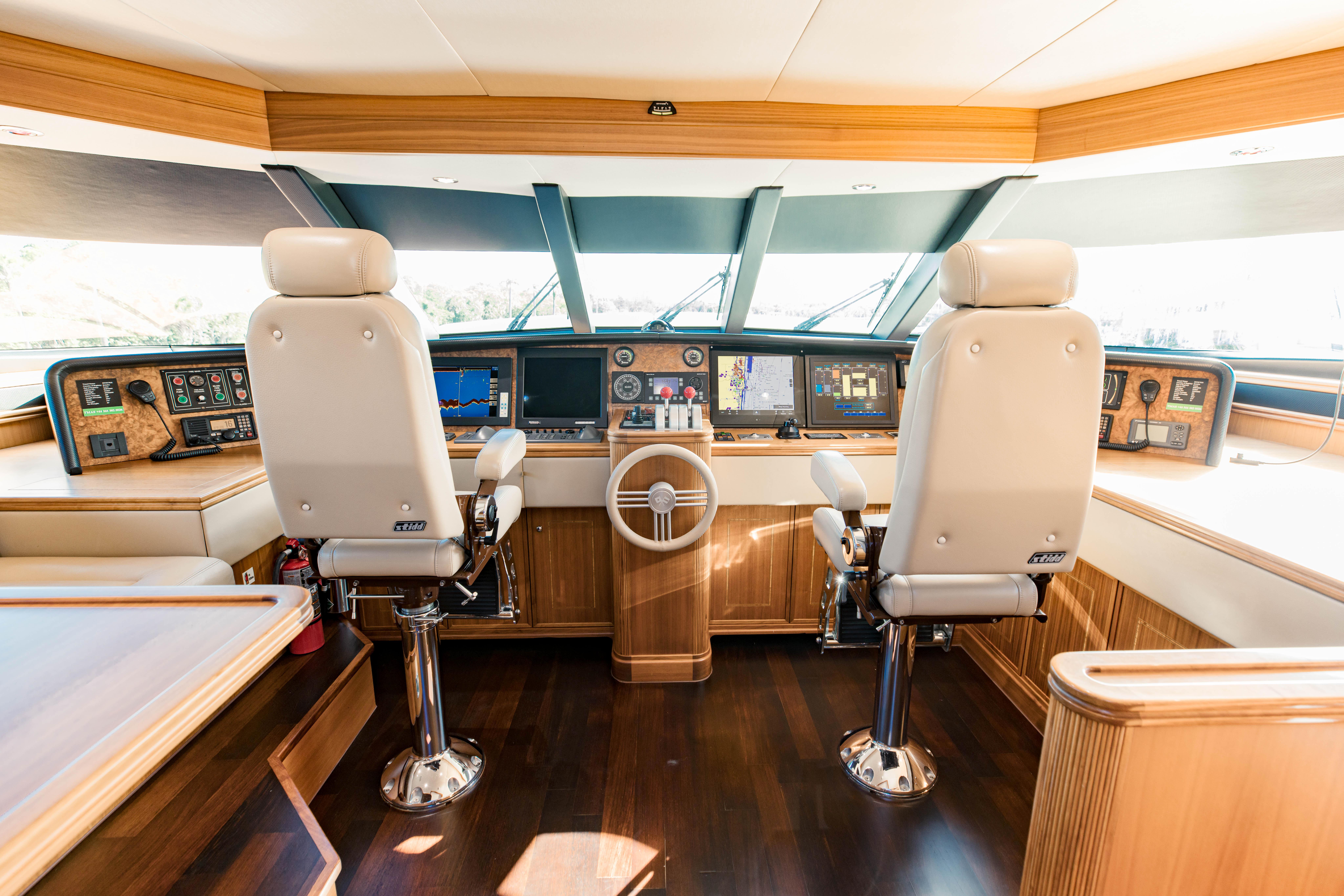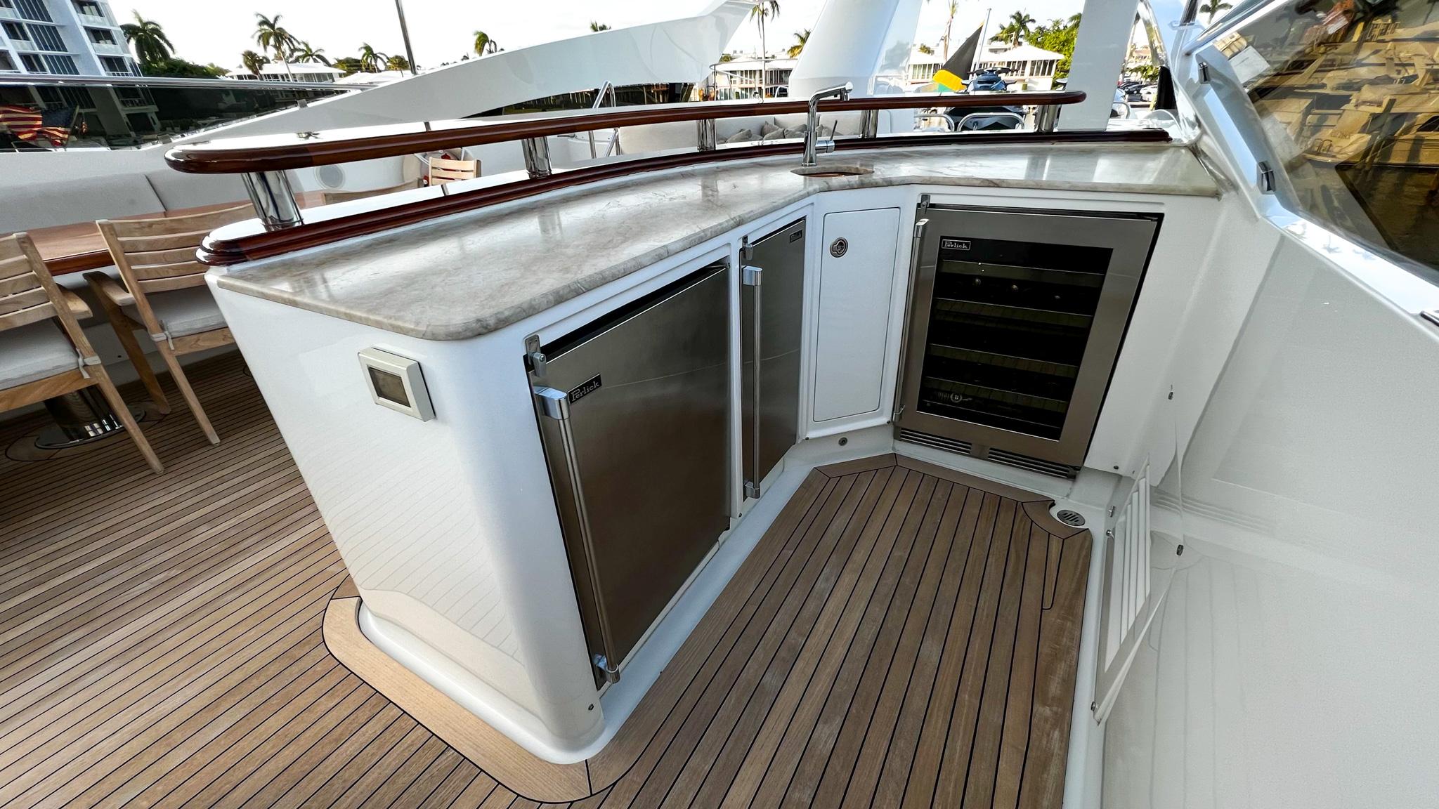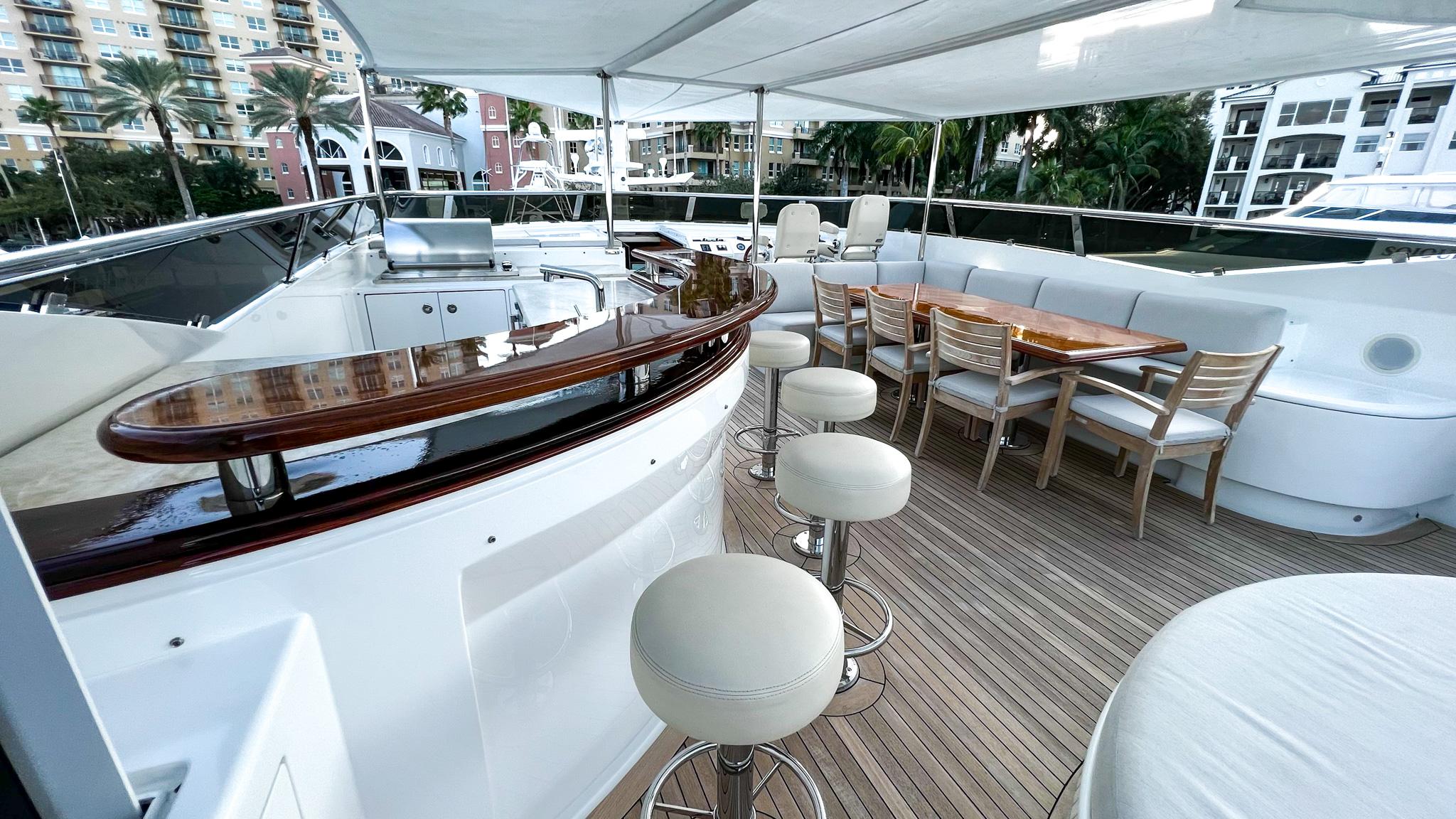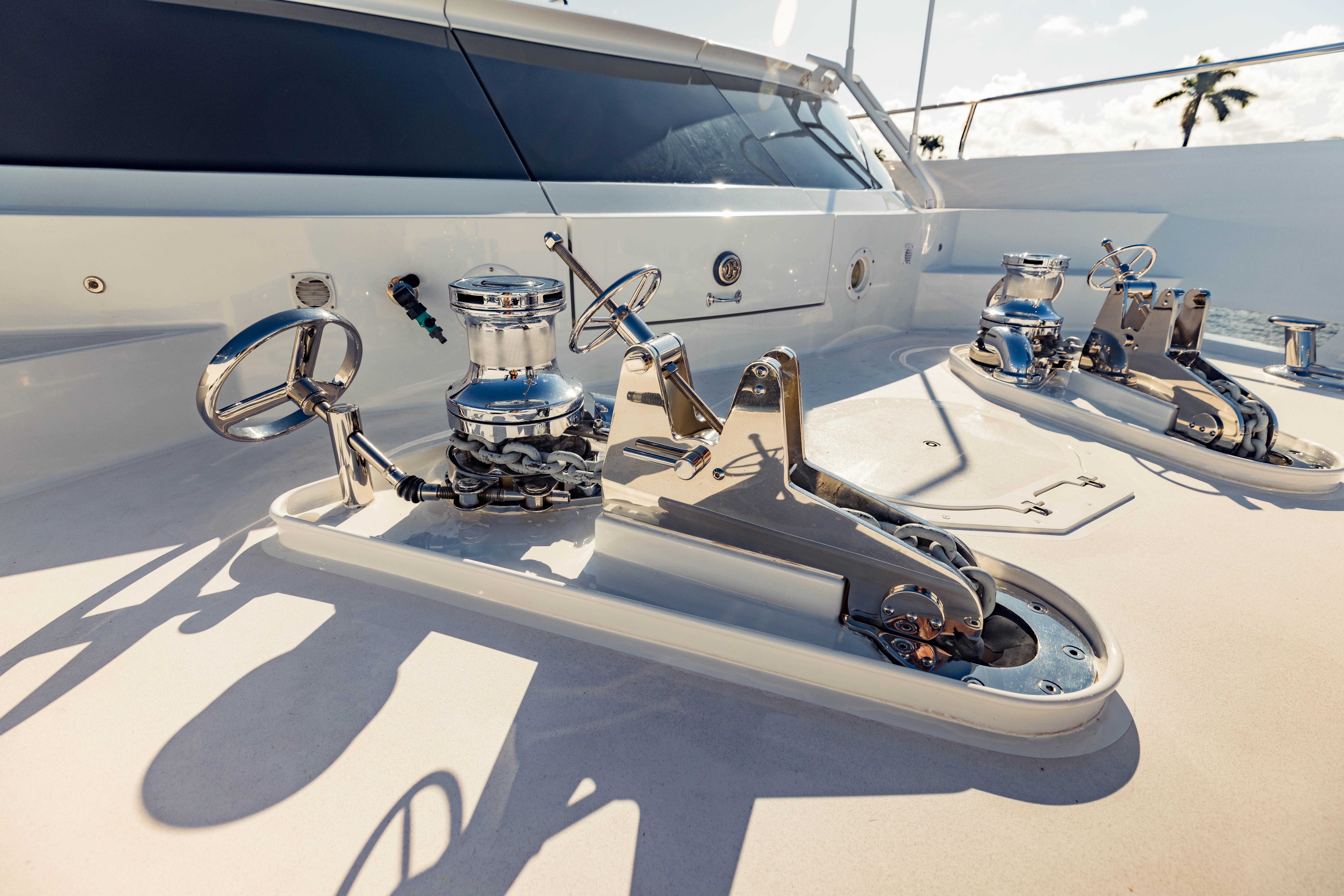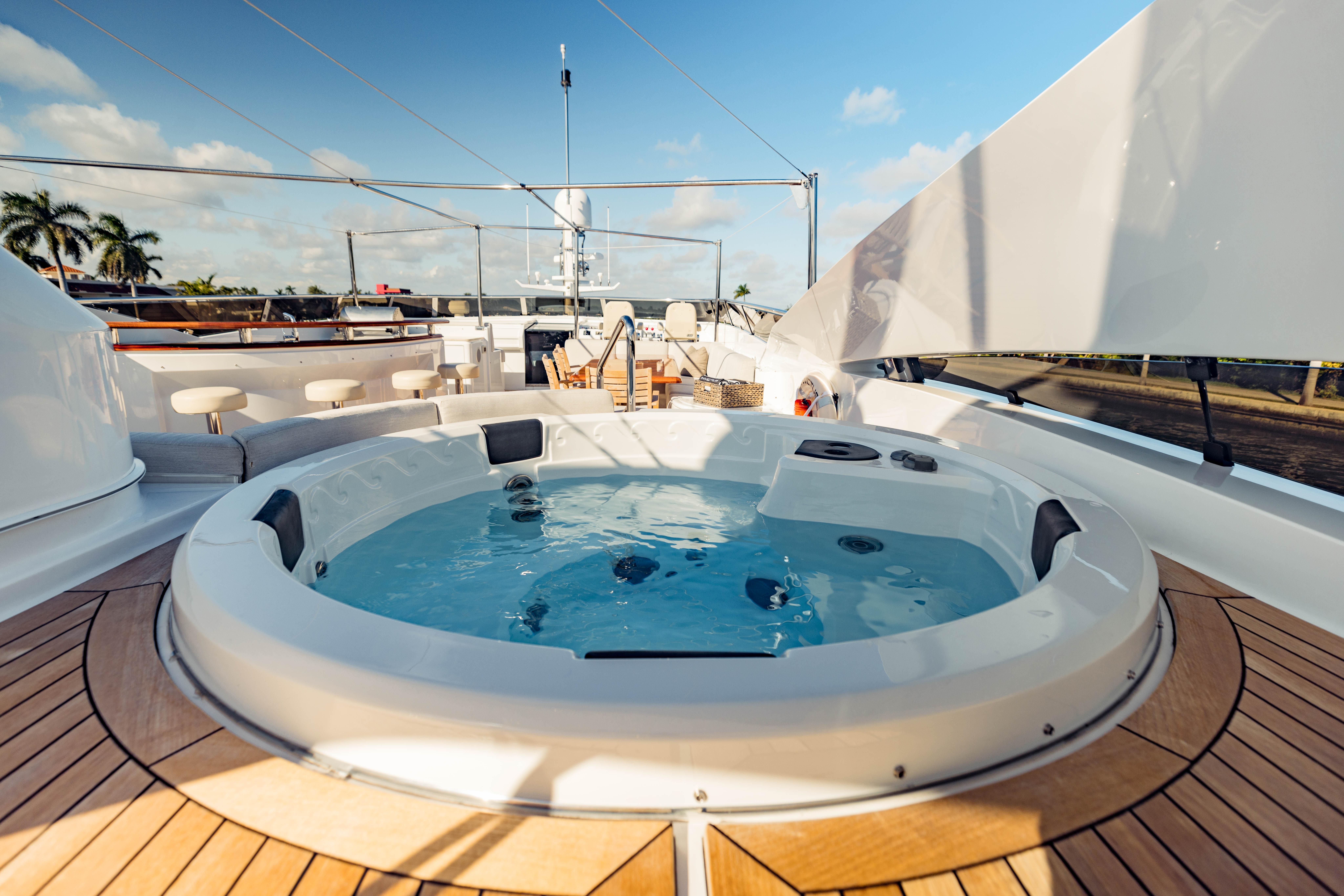 The yacht’s luxurious features include a flybridge with a hot tub, two Stidd helm chairs, and a bar adorned with a Carrara Crema marble top, perfect for entertaining. The interior has recently undergone a soft goods refit, enhancing the comfort and style of the full beam, on-deck master stateroom. For those who enjoy water activities, the yacht is equipped with a large Boston Whaler Tender and two jet skis, while the dual-purpose aft deck with a swim platform offers easy access to the sea. An Atlas Frequency converter with a seamless transfer system ensures smooth operation, making this yacht a superb blend of luxury and functionality. With engines at 1300 hours since the top-end rebuild and generators at 2100 hours since their overhaul, this yacht is ready for its next adventure.