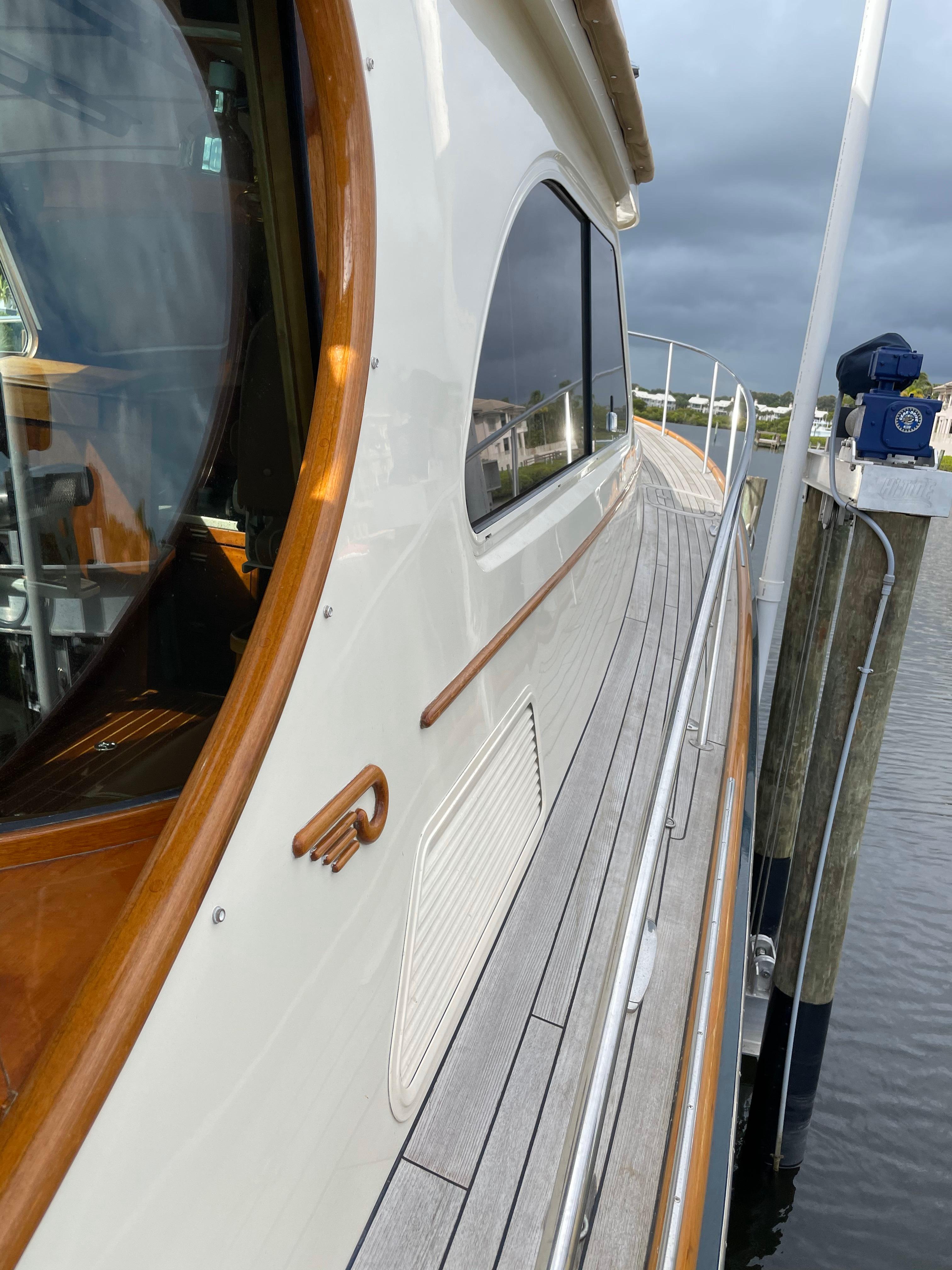 Introducing the Hinckley Talaria 44 FB, a 2008 model that combines classic elegance with modern technology, making it a standout option for those in the market for a yacht that offers both style and substance. Located in Stuart, FL, this yacht is priced at $1,100,000.00 USD and measures an impressive 44 ft in length. It boasts a striking Land Rover Green Awlgrip topside, completed in 2022, and a faux wood transom that adds a touch of traditional charm. The yacht is powered by twin Cummins QSC 8.3 600 HP engines, with a comprehensive engine service completed at 1,000 hours, ensuring it is in prime condition for its next owner. The Onan Generator shows only 379 hours as of 2020, highlighting the yacht’s well-maintained status. Additionally, the Talaria 44 FB features a flybridge with a custom safety gate, mast, and full Eisenglass enclosure, alongside teak decking and varnished teak accents that enhance its luxurious appeal.