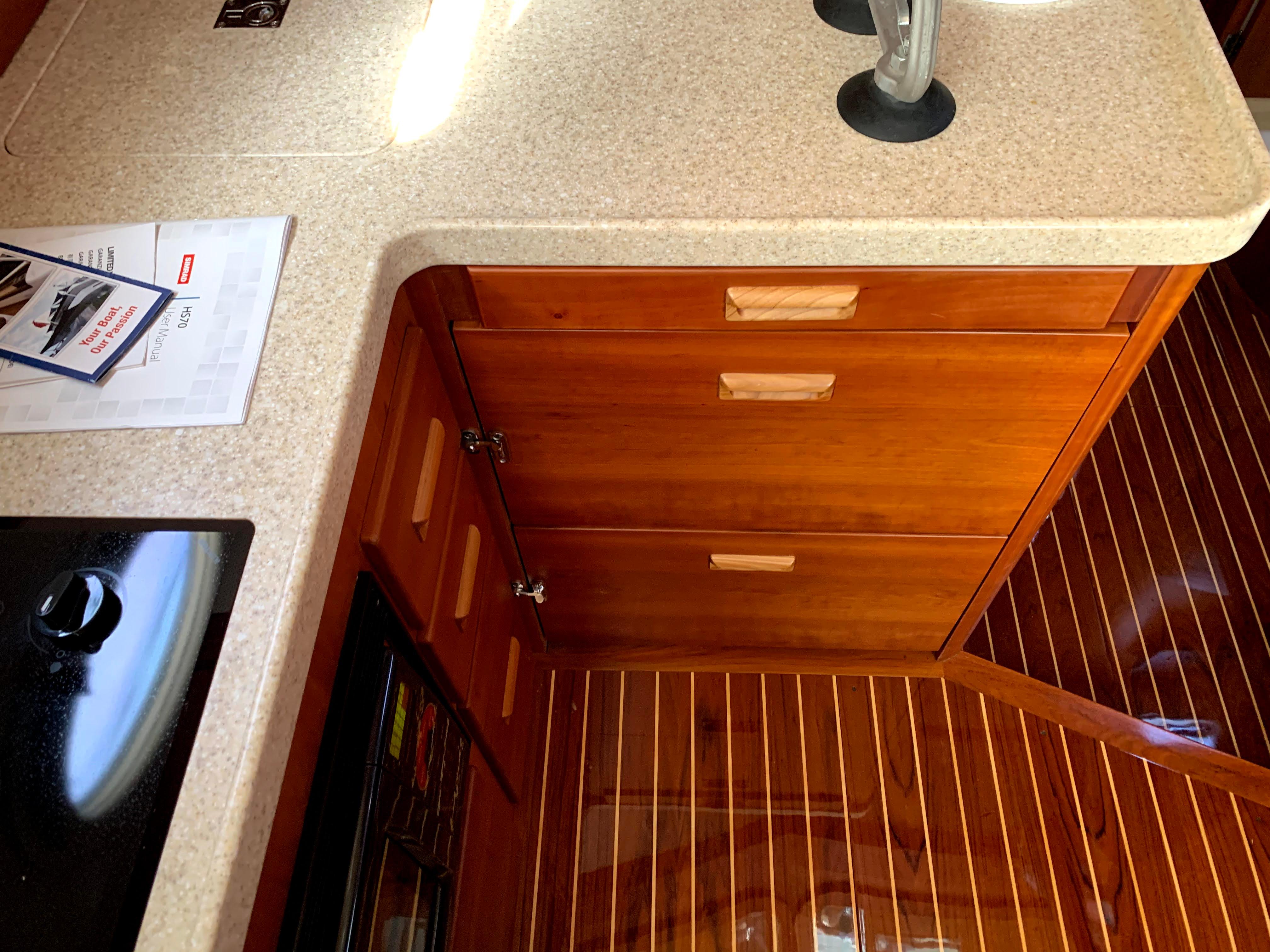 Exclusivity is evident in its custom features, including teak decking in exterior areas, varnished teak accents, and a custom safety gate on the flybridge. A highlight is its custom concealed bar, designed for discerning wine and cocktail enthusiasts. Moreover, the yacht’s bespoke storage solutions cater to the gourmet entertainer, showcasing its readiness for both short-term escapes and extended voyages.