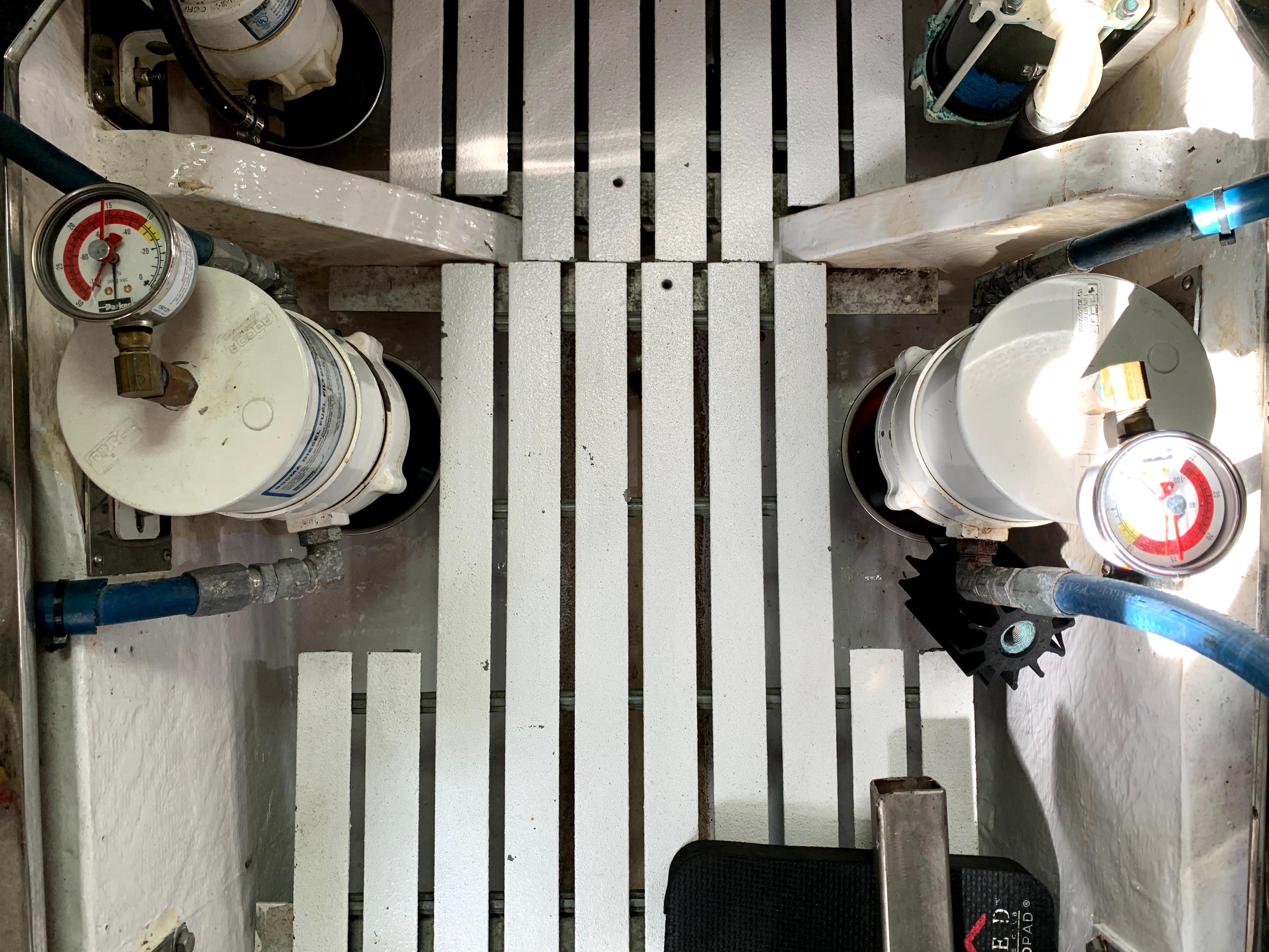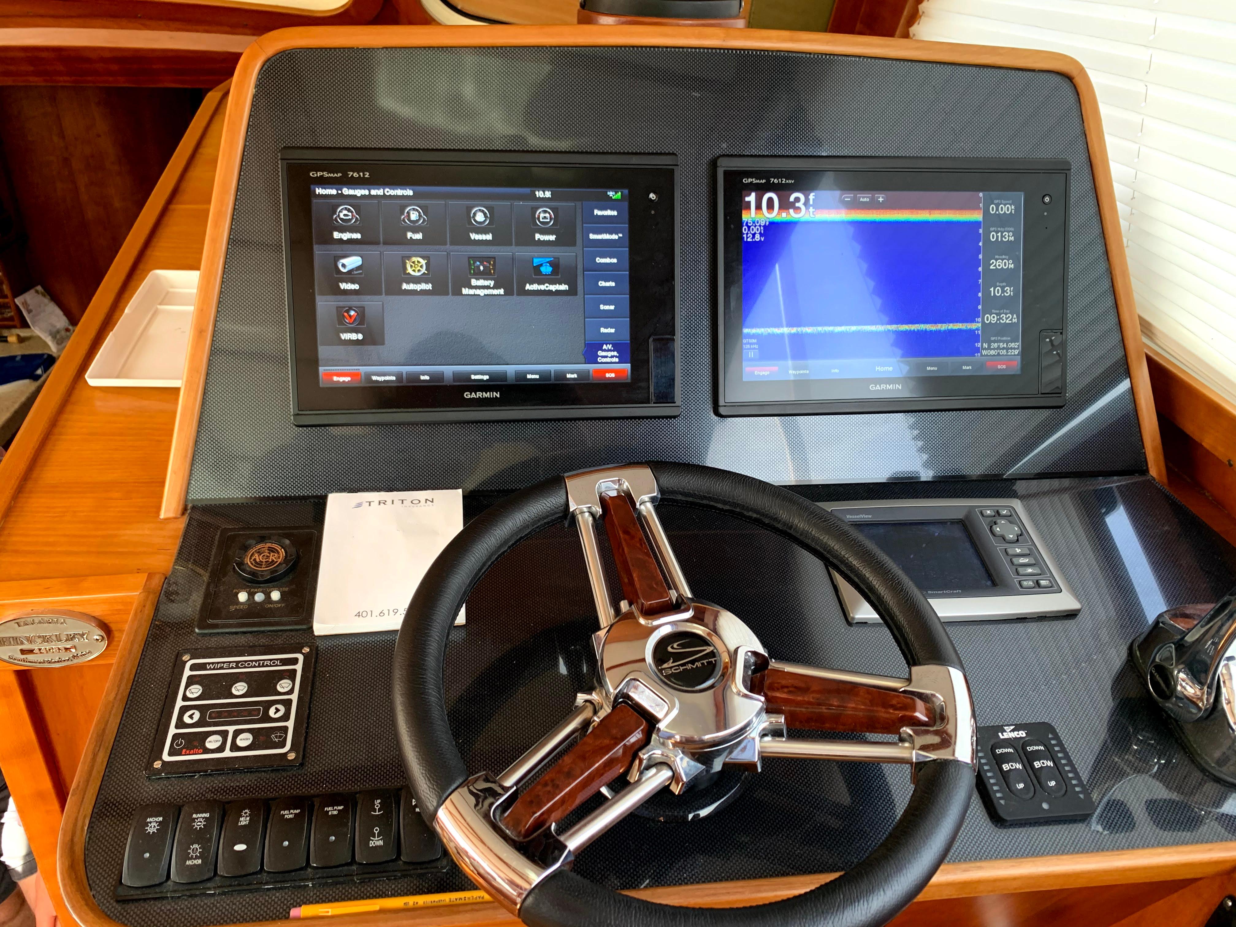 Steering SystemJoystick Control VESSEL WALKTHROUGHHULL & DECK: (2022) Land Rover Green Awlgrip topsides (2022) Faux wood transom Light Cream gelcoat deck and cabin top with molded-in side and foredeck covered in teak decking. (2022) Single Cream Awlgrip Boot Top Red bottom paint. Construction: DualGuard™ Composite Construction and SCRIMP® process. Hinckley’s DualGuard™ construction has a skin coat of chopped E-glass mat in low shrink vinylester resin, an outer skin of Kevlar/E-glass, a core of end grain resin-sealed aircraft grade balsa and high-density foam, and an inner skin of carbon fiber. Marelon ball-valve type seacocks installed flush with the hull. Rub rail has stainless steel half-round on solid PVC molding. Flybridge is through-bolted to the pilothouse. Swim platform – with teak inserts and stainless steel half round with a stainless steel telescoping 3-step swim ladder under swim platform. There is custom gunwale guard on the aft face of the swim platform. DECK: Flybridge with surround coaming, aft stainless steel pulpit with custom safety gate, and flybridge mast Stainless steel custom bow rail All handrails are varnished teak. Handrails – mounted on flybridge sides and pilothouse side – port and starboard. Teak deck exterior walkways, stern and foredeck areas, deck step and seating and ladder base areas. Anchor locker is molded into foredeck locker with hinged gas spring assisted hatch. Remote control for anchor windlass as well as control at helm. Anchor also can be pinned in place or pivoted back into the locker for a clean look. A salt water deck wash is in this foredeck locker. Tapered varnished teak toe rail with Hinckley profile, stripped and re varnished in 2022 Varnished teak eyebrow around cabin top, stripped and re varnished in 2022 (2017) (5) Stainless Steel deck hatches with smoke gray Lexan. (6) Elliptical trunk cabin opening port lights with removable screens. Stainless steel chocks and mooring cleats, with pull-up cleats for spring lines. Outboard mid-deck locker. Stainless steel deck scuppers. Multiple fender pad eyes with stainless steel half-round chafe strips on toe rail Aft transom handle – painted to match hull Custom housetop hold-downs for Shaw and Tenney boat hook COCKPIT: Entry to the boat is either from the side or through the transom. A centerline transom door with stainless steel clasps opens from the swim platform. Removable stainless steel with teak tread boarding steps – mounted aft of engine boxes – port or starboard. Features include: Teak cockpit sole Stamoid cockpit cover – attaches to pilothouse top Aft-facing settee portside. Custom port and starboard transom seats – has a removable center section at transom door. (2021) Cockpit cushions Perennials Beachcomber / Neptune stripe Port cockpit table – can be attached to port coaming and can be used from stern or engine box seat. Table stores in port stern storage box Cockpit courtesy lighting on dimmers Bose 131 cockpit speaker pair with volume control. Cockpit shower with mixing valve near transom door opening. Glendinning shore power cord deploy/retract system with wireless remote Custom stainless steel arm for holding shore power cord fits in fishing rod holder. Custom port and stbd storage lockers in cockpit aft corners. Port locker houses storage for custom cockpit table. Stbd locker offers storage for cleaning supplies. Each includes a varnished teak cover with drink holders. Storage is available in insulated and drained cooler/fish box locker on the aft deck and cockpit sole hatch. Aft rod holders Shore water inlet – port forward – with regulator valve FLYBRIDGE: The custom Nautilus 14-gauge 1.25” stainless steel ladder with teak treads leads up to the flybridge area. This ladder can fold out of the way when not in use. The molded three-sided flybridge has sides that curve downward and has a molded in nonskid sole. Aft stainless steel stern pulpit wraps around forward port and starboard. There is a custom stern pulpit safety gate of contrasting color. Forward is a wrap-around venturi windshield. Flybridge mast – also includes flag halyard and KVH satellite receiver. L-Shaped settee to port and aft of helm seat has cushions finished in Holly Ultraleather Plus with cushion storage and sun pad storage inside. Table – A removable, varnished teak flybridge table stores in the port settee locker in a custom padded bag. Custom corner table built into settee with insulated ice tub and recessed drink holders, hinged teak lid. Custom bimini top and full Eisenglass enclosure. Varnished lightboards on flybridge sides Aft seats store 6-man liferaft with Stamoid cover Custom Stamoid deck hatch covers – with owner’s signal Helm: Forward is a molded helm with a custom varnished teak steering steel wheel, JetStick® II, complete engine instrumentation, (2017) Garmin 7612 XSV C MFD Chartplotter, Radar, GPS and Command mic for lower helm VHF, and mounted Danforth Constellation compass. There is also built-in mug holders. Custom manual 1.5 Stidd helm seat that pivots and covered in Spinneybeck Leather: RA1806 with VO-944 piping. Table – Custom removable table with two folding leaves, two aluminum pedestals – located at the port settee. Air horn – custom hidden-mounted Bose 131 speaker pair with volume control. Stamoid covers for flybridge seat, settee seatback, and helm pod PILOTHOUSE (Amidship): The Pilothouse is entered through a varnished teak door that has an opening window with screen and faux painted window frame. The Pilothouse features: Varnished teak cherry veneer on exposed FRP surfaces except seatbacks. Varnished teak dash and coaming. 3-Forward tempered-glass, green-tinted, fixed windows with windshield wipers & washers. The pilothouse side windows slide open giving the helmsmen additional ventilation. White noise-absorbent overhead Chelsea clock-strike clock and barometer custom mounted in center valence face Pilothouse Layout: Forward, to starboar