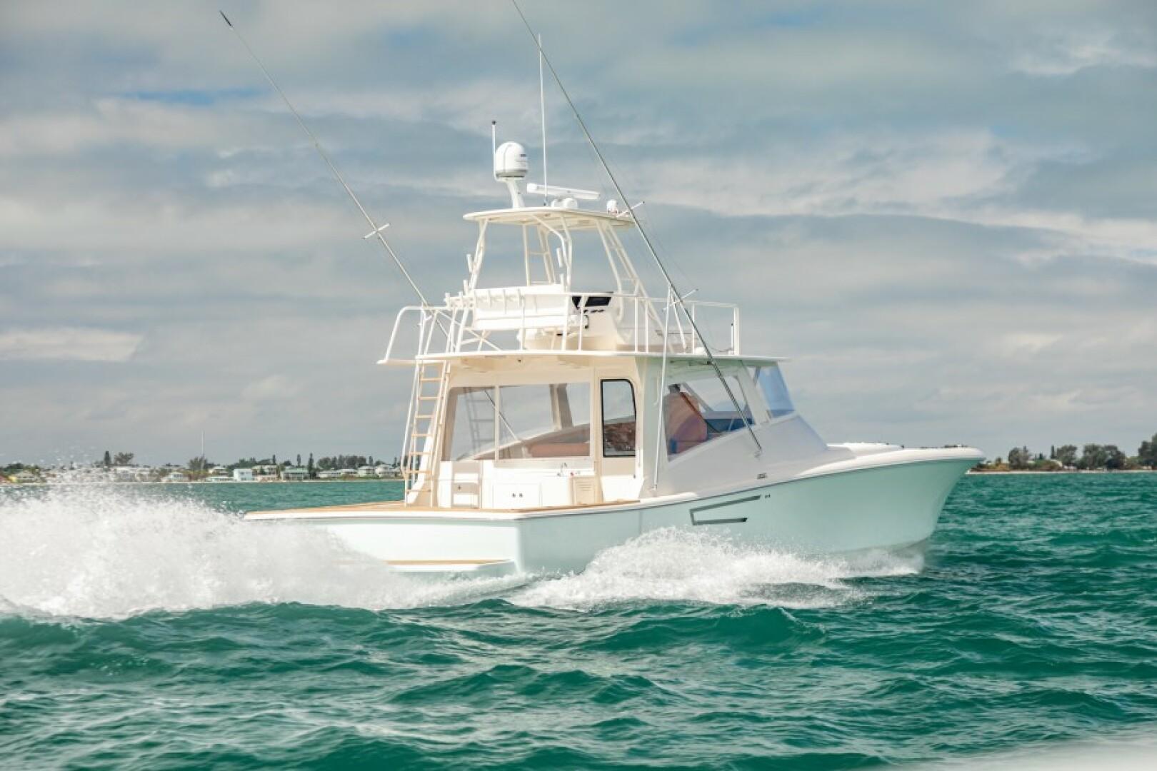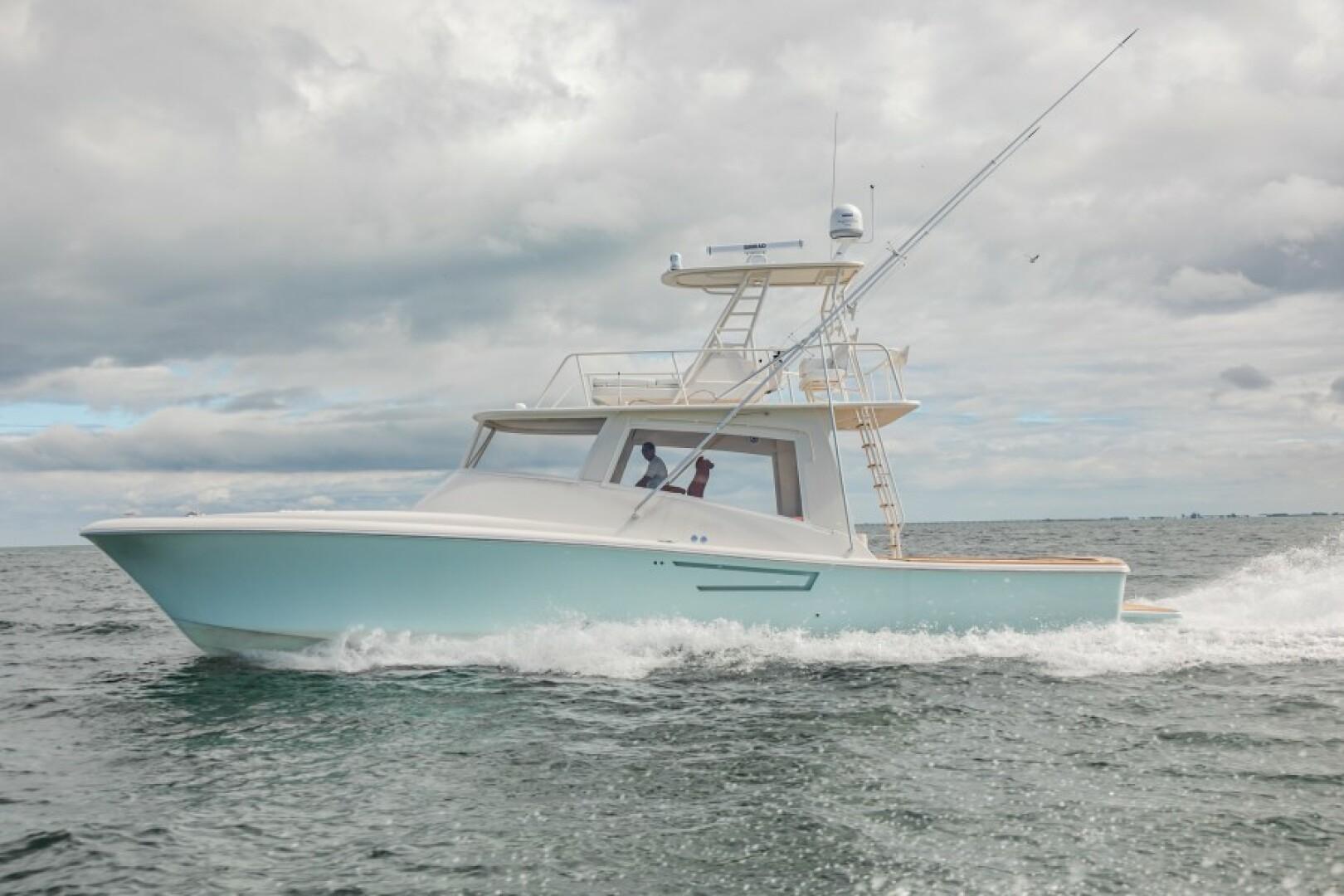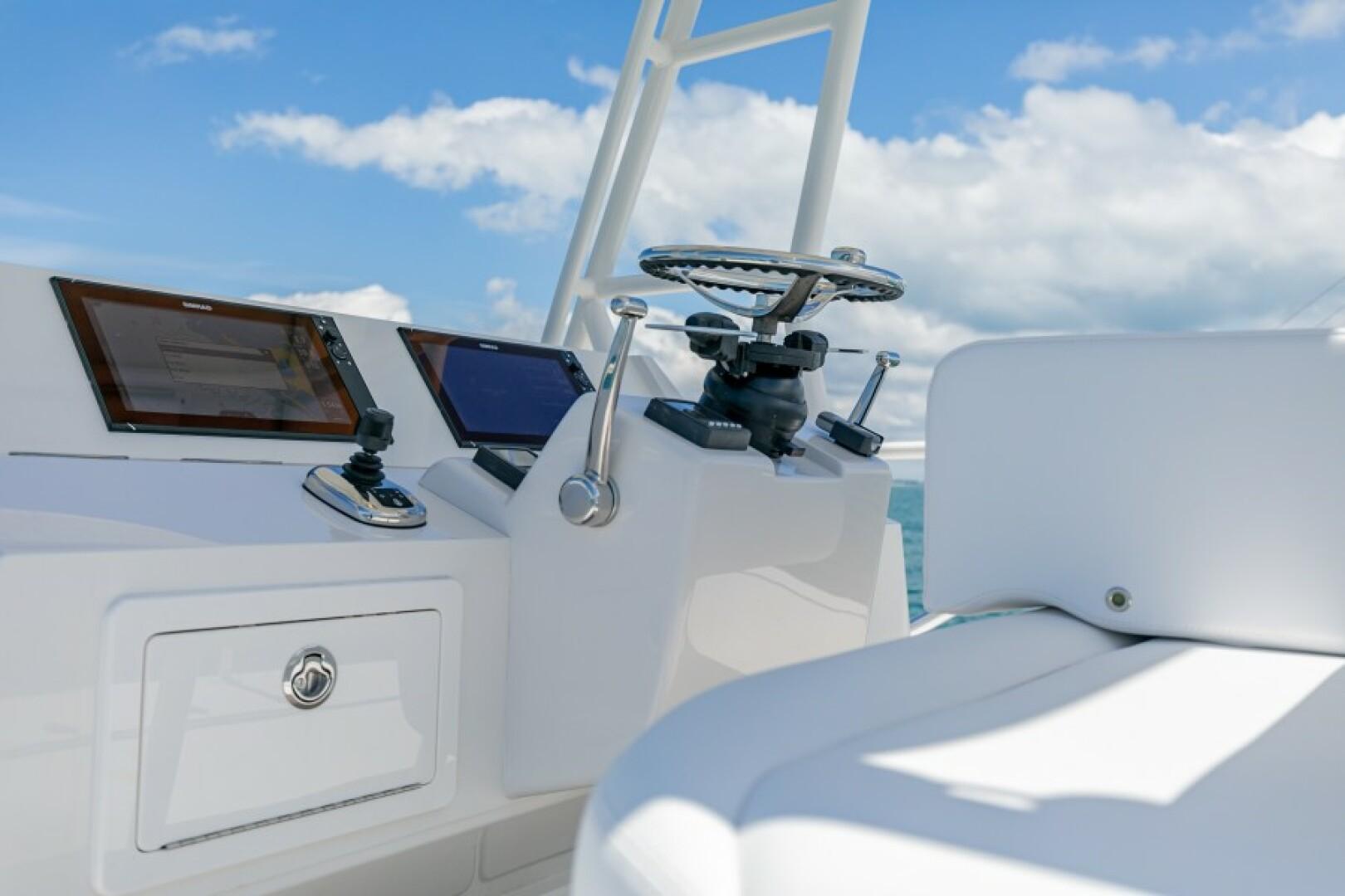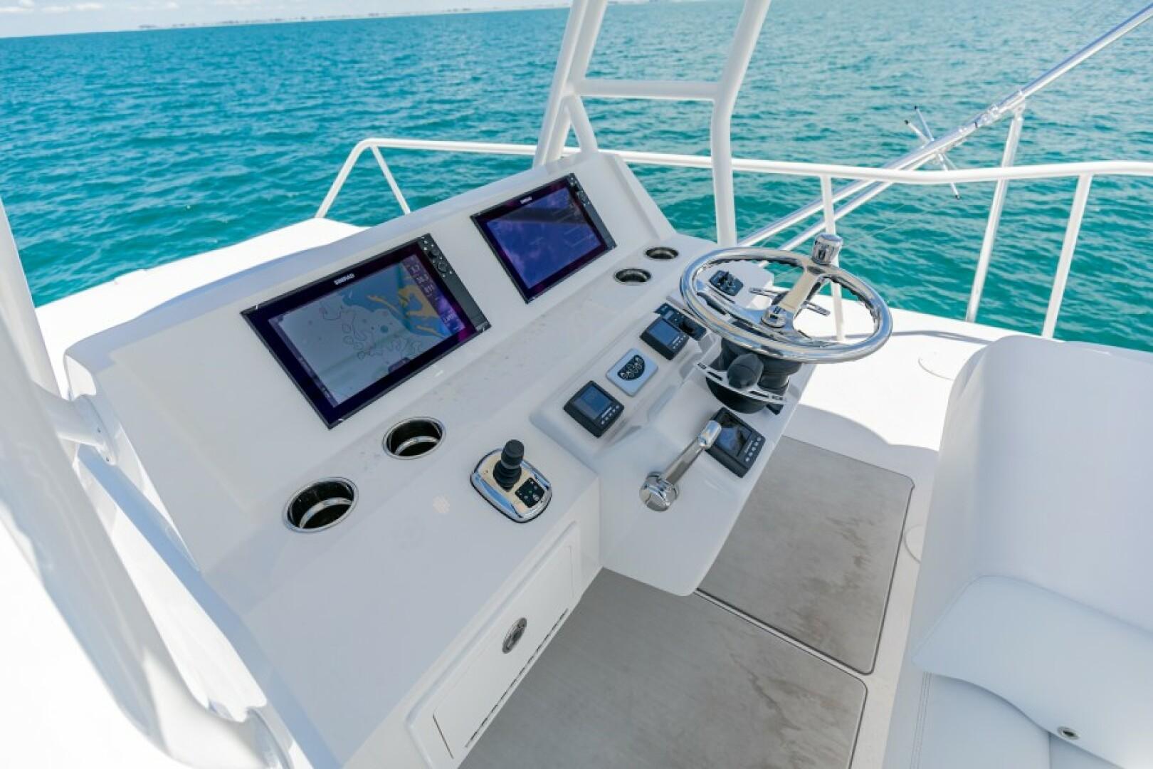 Standard Features Custom Hull Color: Aquamist Upgrade Carbon/Glass Infused Hull and Major Parts – Incremental Cost Difference Onan 13kW Generator Carbon Infused Dive Platform Acrylic Tackle Station Cook n Dine Stainless Tepanyaki Cook-top Kenyon Ceramic Single Burner KRA Refrigerated Floor Box Eskimo Ice Maker 32 GPH Watemaker/ RO Purifier Dual Intake for Dock Water and Saltwater MarineDeck 2000 Helm Station, Cockpit and Swim Platform ACR LED Searchlight with Wireless Remote Dometic STIIC Digital Controller Runs A/C, Freezer and Ice Maker from Helm Resin Infused Hardtop, Second Station with Carbon Hard Buggy Top Rupp Hydraulic Outriggers Solid Teak Covering Boards Upgraded Stainless and Sileather Helm Chair Upgraded Memory Foam Mattresses Custom Bedding – Quilts, Sheets, & Pillows Upgraded- VARC Dometic A/C Chiller System Upgraded EZ2CY Eisenglass Marine Mat/SeaDeck – 2nd Station Decking Upgraded Solid Entry Cabin Door Upgraded Teak Look Helm Pod Lumitec Razor Light Bar Stainless Anchor – 3/8” Chain, Swivel. ¾” 8- Plait Anchorline Maxwell Windlass and Roller with Remote AGM Battery and Charger Glendinning Controls and Joystick – 2 Station Dual Wireless electric Teaser Reels in Custom Fabricated Aluminum Power-Coated Box Electronics and Stereo Fireboy Fire Suppression System, Engine room Ventilation Temperature Control, Mist Eliminator Pair Spare Veem Props Copper Bottom Paint Burnished to 600 Grit Eisenglass and Covers for a Second Station Optional Equipment NSS EVO3 16” Upper Station NSO EVO3 24” Main Helm NSO EVO3 19” Main Helm NEP-2 Network Boxes S5100 Sonar Box RS905 VHF Box Wireless VJF HS35 Sonar Hub Box Side Scan Transducer Airmar 265 L/H Transducer Airmar 175 SS-W Transducer Simrad OP50 Remotes Flir Remote Control Camera Flir Controllers Samsung N5300 Monitors Direct TV H24-700 Receivers RI12 Radar Box Simrad Halo Radar Simrad Precision 9 Compass Fusion MS-RA770 Stereo Simrad GS25 GPS Antenna Tracvision TV5 dome Satellite Underwater Light Spectrum Color with Controls Dolphin 12-volt Battery Chargers Simrad SG05 Autopilot Integration Interface C-Zone Digital Switching System Bluewave 4 channel Amplifiers Bluewave Mono Amp 7.7 Bluewave Speakers Bluewave Enclosed Subwoofers