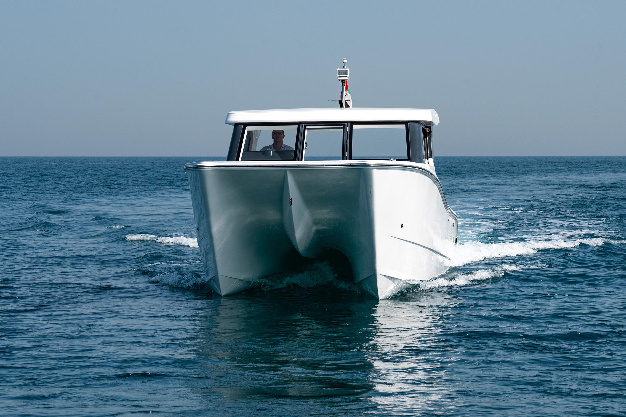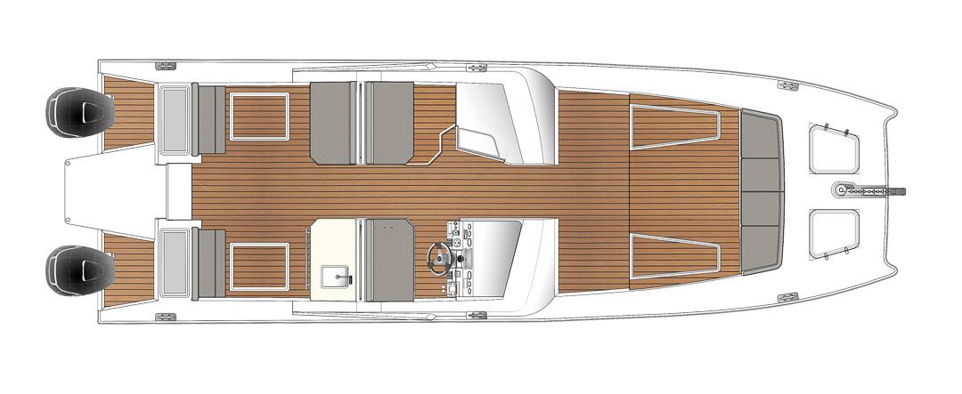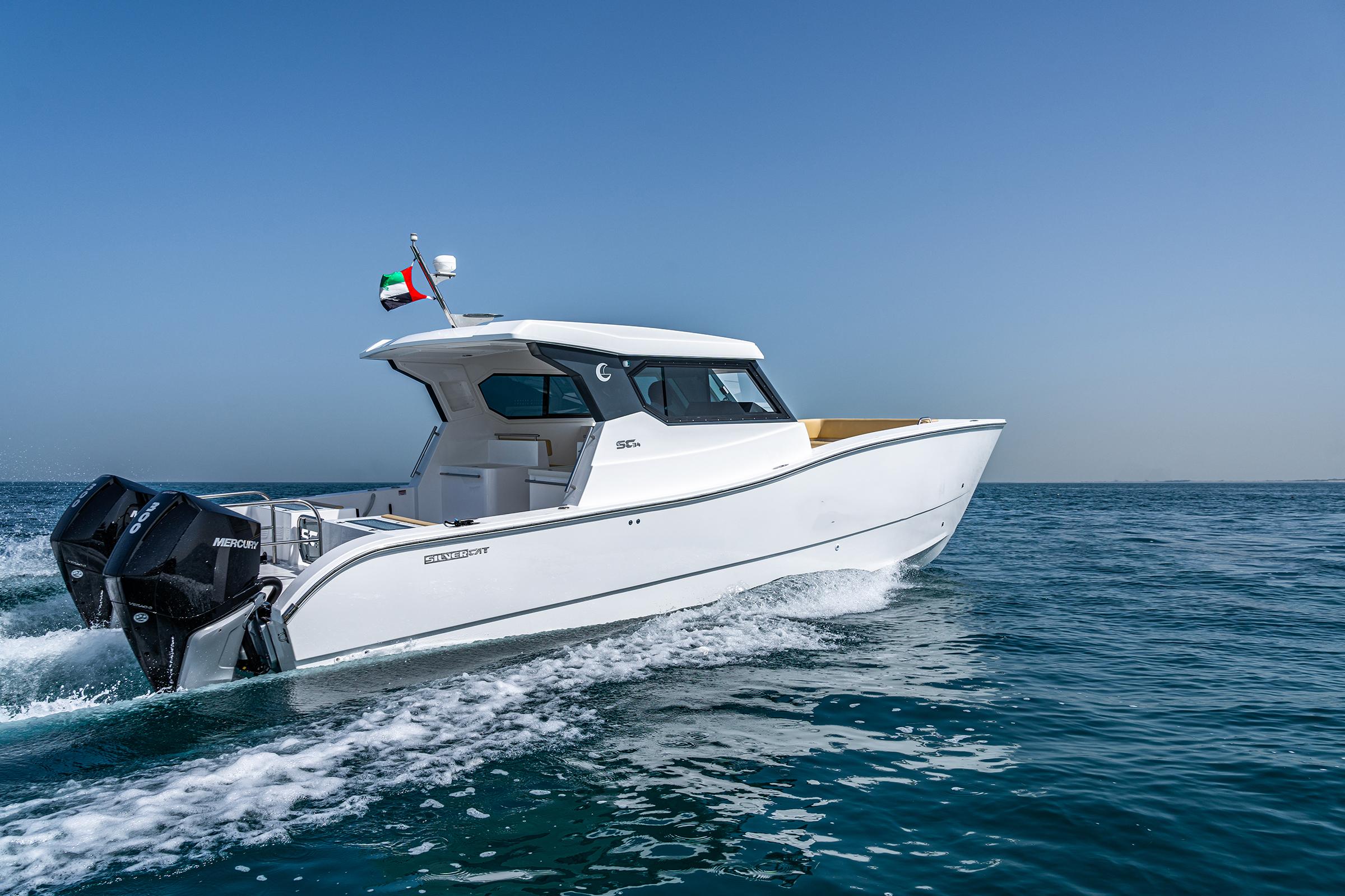 DescriptionMulti-functional and multi-faceted with superb hull that has been re- fined for the high seas. The striking Silver CAT34HT features superb finishes and an ocean-going hull that has been refined for the high seas. Able to handle some of the largest swells on the waters with efficiency, the unbeatable Silver CAT34HT is fitted with a fiberglass hard top, which provides a large area of shade perfect for entertaining, and different utility applications. The folding cockpit seats maximize the space for fishing, diving, or socializing, while the potent engine options can see you take off at speeds of up to 50 knots. Silver CAT34HT also comes complete with an electric marine toilet, sink, and hand shower so that you can enjoy long days at sea with every luxury. Multi-functional and multi-faceted SilverCAT34HT has proven unbeatable in its class – a cut above the rest – and is sure to facilitate every dream you have for your next boating journey. FeaturesAudio System (Stereo+4 Speakers)Navigation Lights-AnchorLED Ceiling LightsMarine HornFlood Lights 2 Pcs12V BlowerUnderwater Light (2 Pcs)BatteryHydraulic Steering SystemMarine Toilet – ElectricElectric Bilge PumpWindscreen Wiper (Single)Transom ShowerSynthetic FlooringFRP HardtopSynthetic FlooringFRP HardtopHull Stripe SS Windlass Winch with RC PadRod Holders 6 Nos Flush mounted Anchor, Chain & Rope-Deck WashDown System-FWD Deck CleatsBow RollerSwim ladderAntifoulingFire Extinguisher 2Kg Navigation & Communications:Two Multifunction GPS Display 12inchBluechart G3 CardCompass-Bronze TransducerAutopilot Single StationAutomatic Identification System (AIS)RadarVHF Radio Single Station Optional FeaturesLife Jacket (each)Courtesy Light LEDRC Search Light – SingleManual Bilge Pump 2Socket 12V DCShrink WrappingWooden shipping standLoading and Lashing beltsNavigation & Communications:Two Multifunction GPS DisplayBronze TransducerRadarBluechart G3 CardAutopilot Single StationAutomatic Identification System (AIS) Generator & Appliances:Marine Generator 7KWElectric Barbecue 230VRefrigerator 90LBattery charger 40ampShore power socket with 50ft cableSocket 110VAC and DC Principal CharacteristicHull Type: Twin Hull Catamaran Hull Material: GRPLength Overall: 34 ft 5 in (10.47 m)Beam: 10 ft 8 in (3.24 m)Displacement: 3.8 tonsFuel tank capacity: 300 US gal (1,136 l)Water tank capacity: 20 US gal (75.7 l)Max. Recommended HP: 600 hp (448 kW)Max. no. of persons onboard: 10 personsMax loud (including all persons): 2,200 lbs. (1,000 kg)