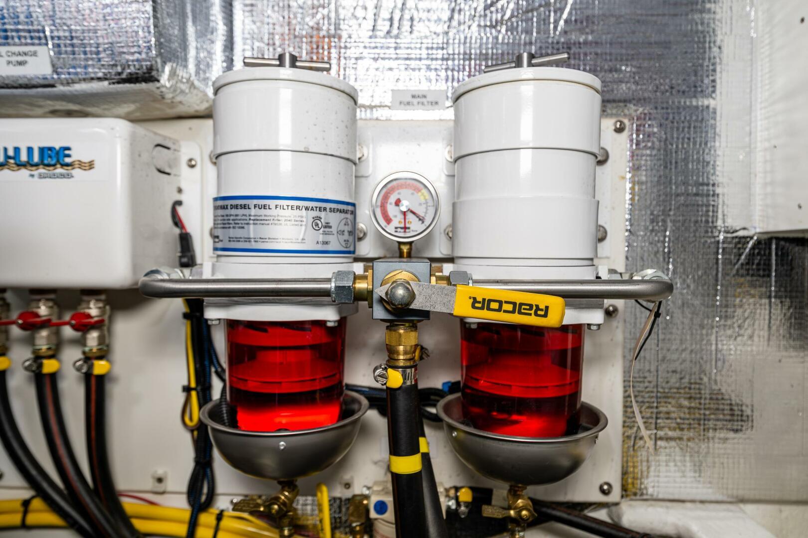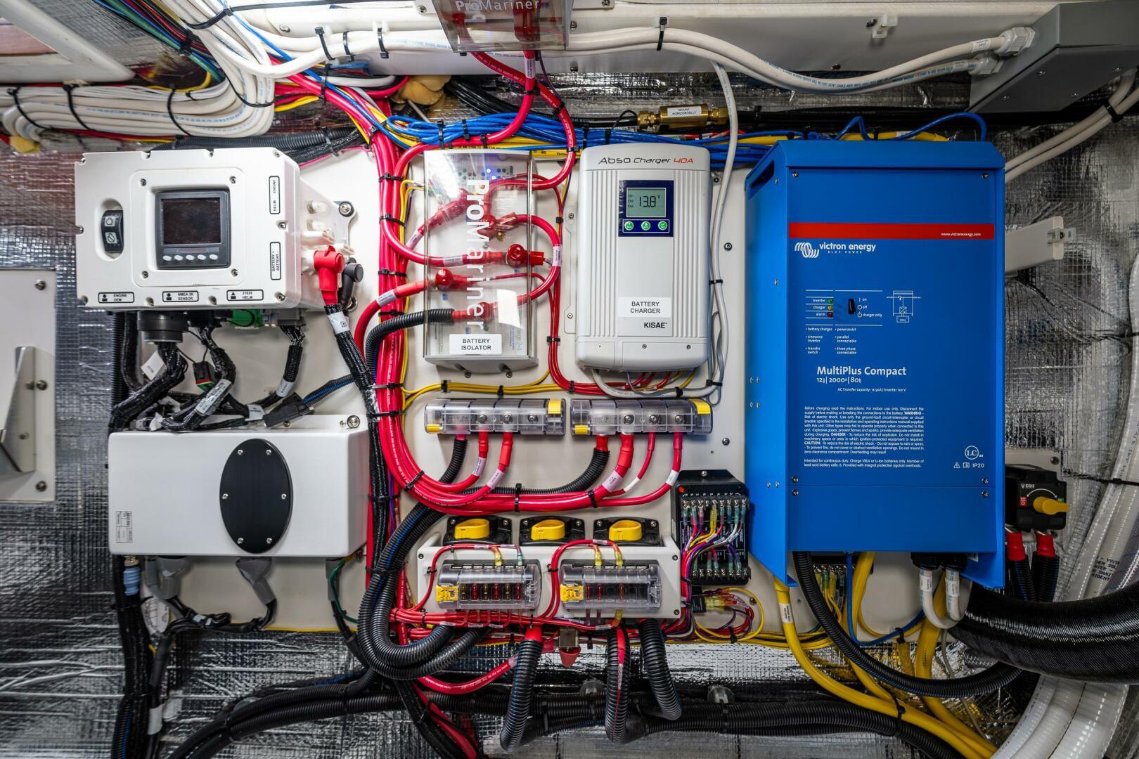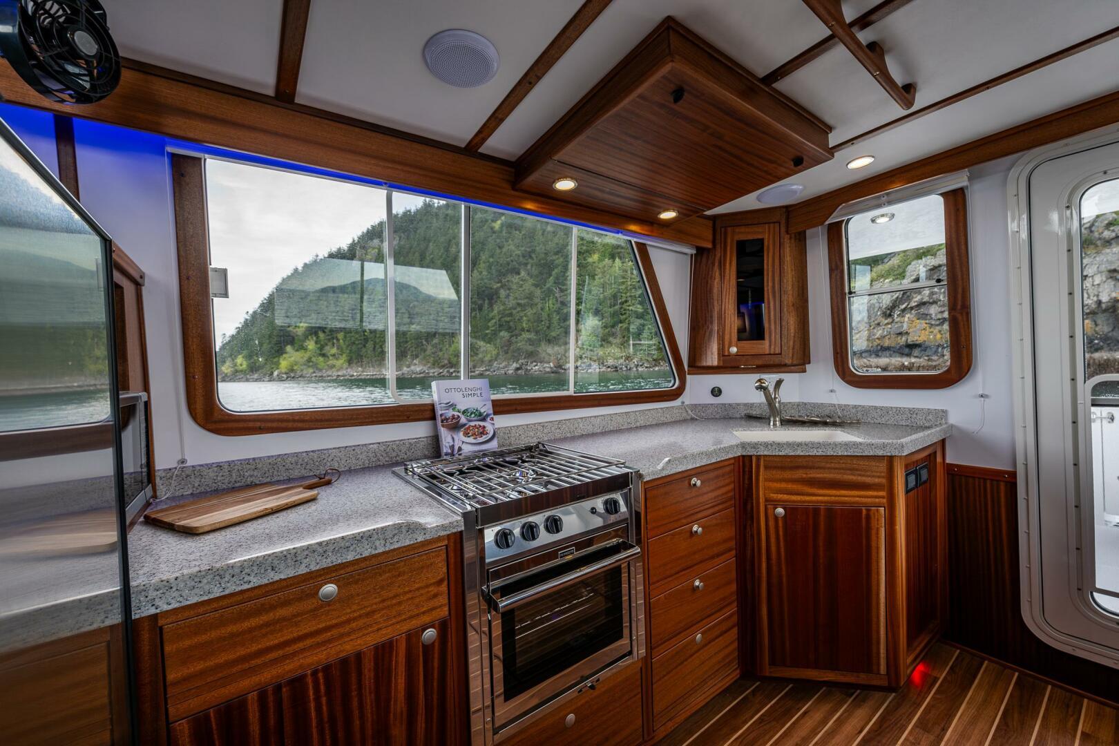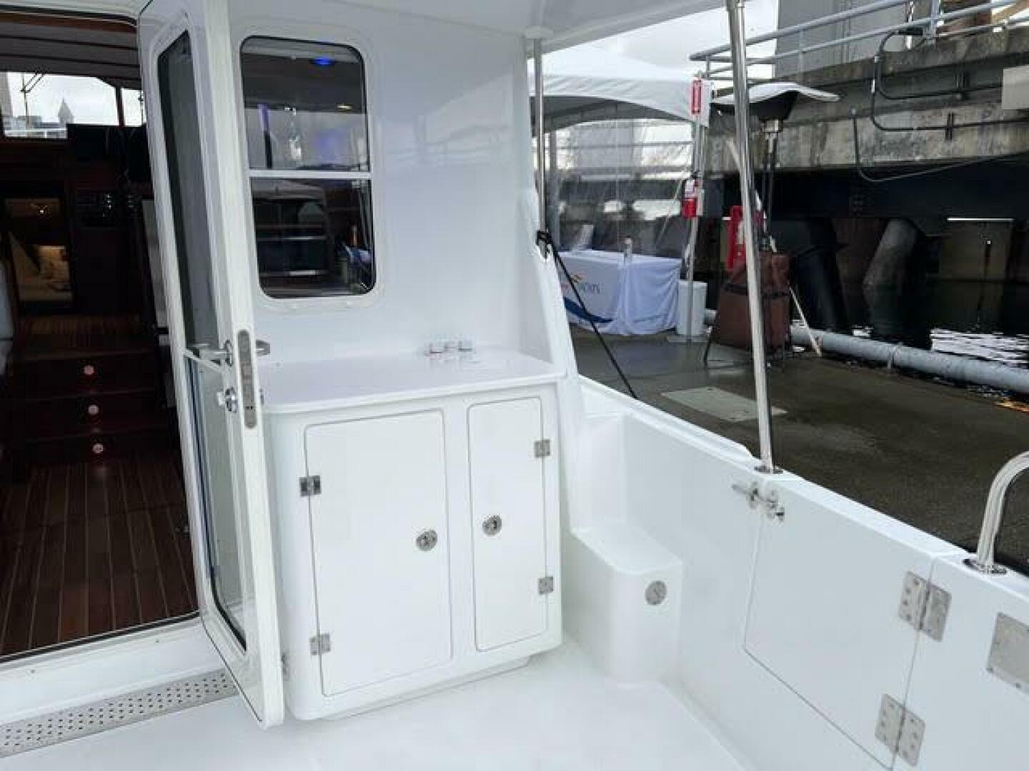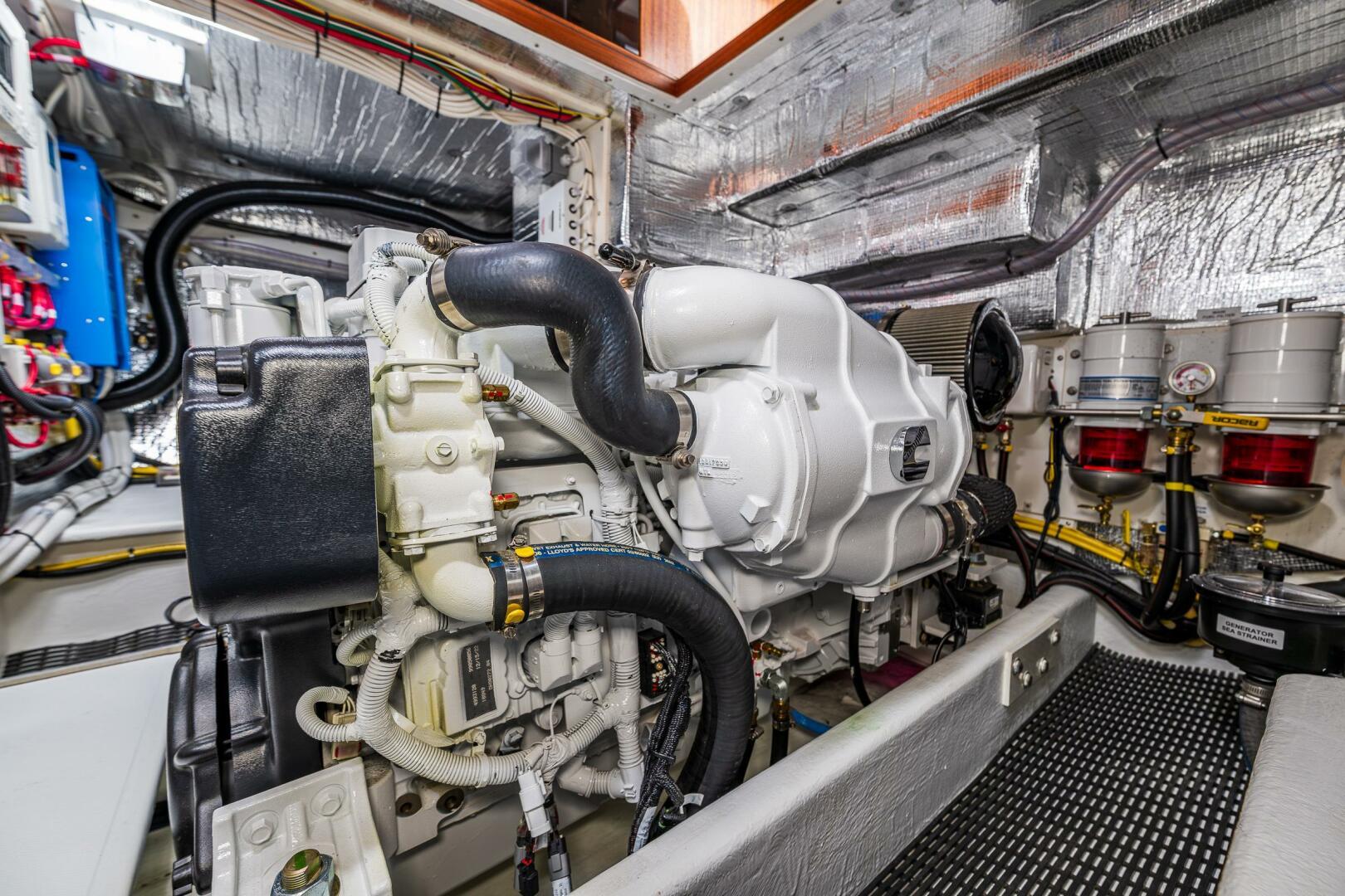 Factory Options• White hull with a blue cove and boot stripe • Cummins 380• Flybridge• Starboard side cockpit boarding door• Epoxy bottom barrier coat• Air conditioning• Forced air diesel furnace• Bow and stern thrusters• Garmin nav pac with two 16” displays at lower helm and a single 16” display at the upper station• Install Garmin upgrade transducer in lieu of standard• Garmin auto pilot• Garmin rudder angle feedback unit• 3000 watt inverter/charger with control panel mounted on overhead console• 9KW generator with standard control panel• Reverso oil change system• Macerator overboard discharge pump• Propane stove with oven and small microwave• Ocean Aire screen/shade for forward cabin hatch• Valance lighting in salon• Day/Night shades in salon• Corian sink in galley• LeBroc double helm and co-pilot seats• Additional hand grabs port and starboard outside pilothouse doors• U-shaped salon settee with small cabinet aft• Amtico flooring in salon and pilothouse, sapele stair treads in salon and forward cabin, carpet on forward berth step – color to be determined later.• Install four cabin fans – 1 in forward cabin, 1 in mid cabin and 2 in salon• Hydraulic steering (in lieu of now standard electric steering)• Sapele paneling in forward companionway• Sapele window trim in PH and in the salon• Raw water washdown forward