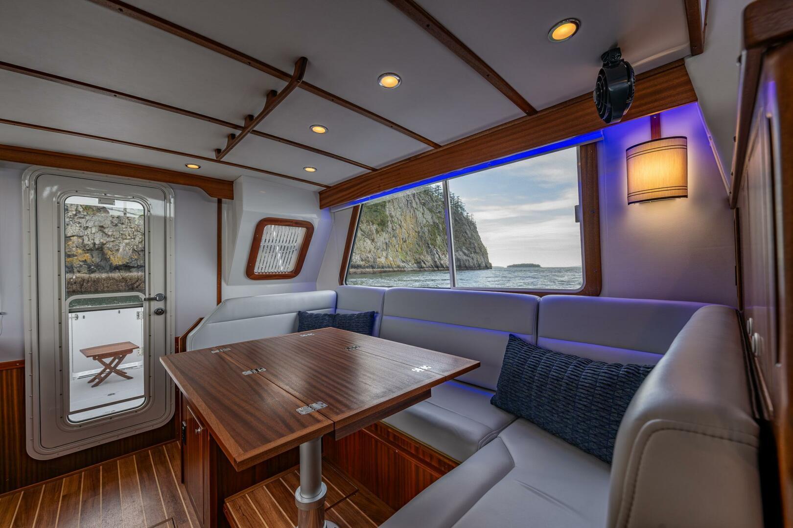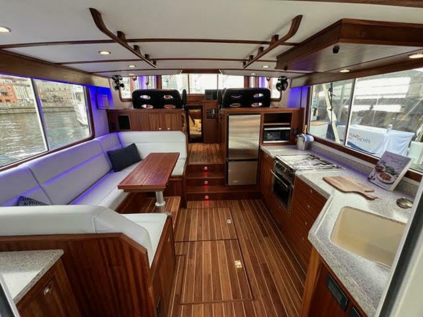 The Nordic Tug 40 boasts several appealing design and exterior features. It has a visually striking white hull with a blue cove and boot stripe. The flybridge adds valuable outdoor space and excellent visibility. For ease of access, the yacht includes a starboard side cockpit boarding door. Practical features like an epoxy bottom barrier coat for hull protection, additional hand grabs, and a raw water washdown forward for convenience and maintenance further enhance the vessel’s usability and charm.