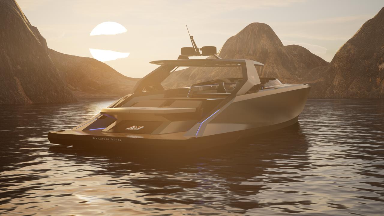 SAY Carbon Yachts – New Masterpiece – SAY 52 The Say Carbon Yachts 52, like all their models, are engineered and manufactured in Germany with the latest 100% carbon fiber technology and Petestep Design hull. Her dry weight is only 7.5 Tons. (15,000 Lbs) Powered by Twin Volvo Penta 430 HP inboards, Aquamatic Duo-prop drives with joystick control maneuverability. Additionally, a carbon fiber hard top and Seakeeper stabilization add to her on-deck comfort. The Say 42’s bright and air-conditioned cabin sleeps up to 4 with a full head and separate shower. Her cockpit is for entertaining with a refrigerator, sink, and lots of seating around a carbon fiber table that converts to a sunbed for those who want to relax. The water access is easy with a large swim platform and swim ladder. But, the #1 experience is the adrenaline-packed driving in twin carbon fiber racing seats with Shockwave S6 bases, behind the Say Carbon roadster windscreen. The cockpit exudes technology and simplicity for drivers who push the envelope on acceleration and racetrack-like precision handling. The results are: SEXY/UNIQUE LINES – and an exhilarating boat to drive and turn heads in every marina. A “Supercar on the Water” FUN – Ultra lightweight that accelerates to full speed in seconds with 870 HP and twin duo prop drives. Furthering the comfortable experience with Seakeeper stabilization. EFFICIENT – Her wave-cutting bow combined with her hydrodynamic hull design and stability side wings, ensure maximum stability for great cornering at high speeds. ECONOMICAL- Ultra lightweight lowers fuel consumption by 50% and extends the range, lowering daily fuel costs at cruising speed. SUSTAINABLE – She’s 50% lighter than any comparable boat in her class, therefore, reducing engine emissions by 50% at cruising speed. For those few, who expect more…. Performance of a supercar with the functionality of an SUV.