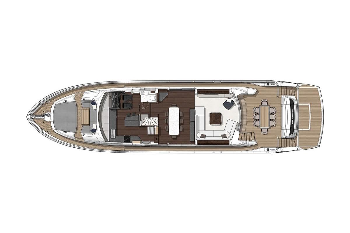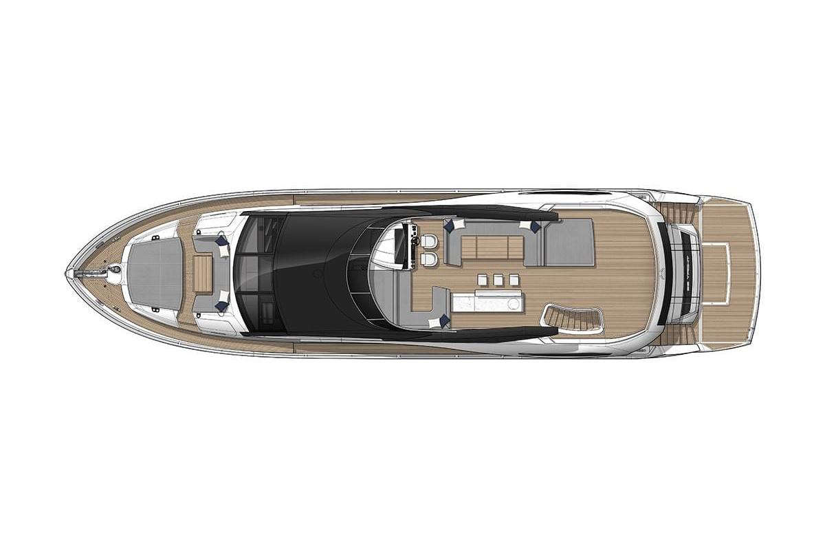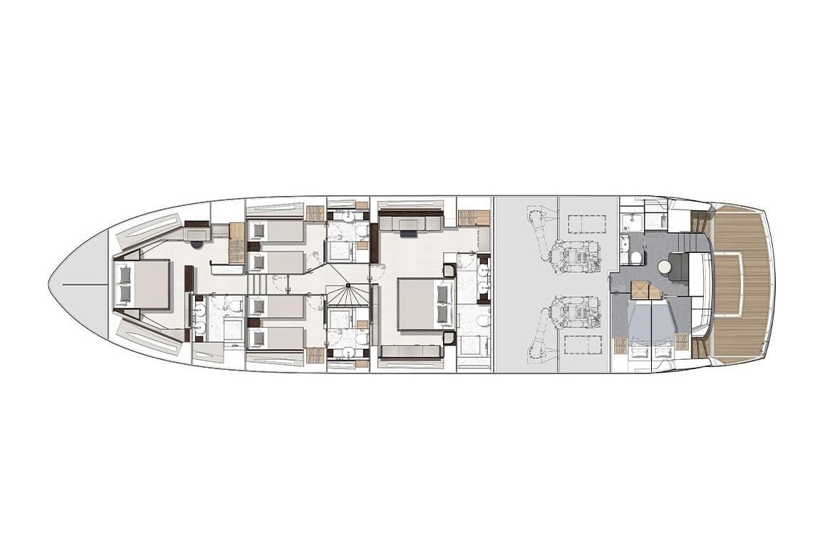 Options8 step side mount stairway with hull fittings port and starboard Main deck dining starboard forward corner bar doors to be replaced with full louvered doors in a lacquer sprayed finish in lieu of the standard glass doors (internal lighting not required). Blue Grey RAL 5008 – Gloss Finish Aft Cockpit Covers Package Main deck dining table to be full stone top with demi bull-nose edging in lieu of the standard design. Stone Finish to be Calacatta Gold – Polished. Aft cockpit Docking Control Station: Main deck saloon and dining to have all electric blinds and curtains. This includes all side windows/doors and aft patio door curtain Aft deck fixed GRP seating with dining table. Seating module to be increased in size to fit entire recess available. Ensure glass gates to bathing platform fully open. See GA for details. Dining table to be on 2 x pedestals with a removable central infill. Table tops to be Natural Teak with V-groove Main deck saloon to have 65” TV fitted in lieu of the standard 55” TV. All Ensuite Shower bulkheads to be upgraded to Porcelain in lieu of the standard Minerva Marine Electric stainless steel BBQ grill 740mm wide on the Flybridge Bootstripe – Jet Black Master Cabin Coffee Table and Forward VIP Lobby Storage Top to be upgraded to Quartz in lieu of standard Minerva. CCTV with 3 Cameras: 2 x Infra-red located in the engine room plus 1 x camera located on the flybridge overhang facing aft. Image to be displayed on a Nav screen at the helm Medium Tinted film to side windows and sliding doors Compass Swinging and adjustment with correction card Parasol with offset post with two sockets. One either side of the Fore deck Credit for non-supply for Co-pilot Helm Seat. Step to be shortened accordingly. Single Helm seat only Performance AV Package Credit for the non-supply of the galley 2 x bar stools. Port guest cabin to be configured with single berths to slide together to create a double berth. Ensure that bed coverings are ordered for both double and single set up. Crew Cabin Navigation Package Safe concealed in cabinetry (8.3 lts. W280mm x H165mm x D235mm) for the Master Stateroom Crew mess 24″ HD Television. In the crew mess and each of the cabins a Fusion Apollo head unit for AM/FM radio, USB input, Bluetooth and Apple Airplay connectivity to users devise with two Fusion ceiling speakers Second Hot water calorifier for boats with 5 cabins or Spa tub. Surejust horizontal 200 litre stainless steel cased tank with 2 x 2kW immersion heaters. Dining chairs to be Frag Doa x 8. Wood finish – Wenge stain and upholstery 07-634. Chairs in lieu of standard Frag Lyo. Separate Miele washing machine and Miele tumble dryer in the Crew Mess Electric roman blinds with black out lining to be fitted in the master cabin. Snib Lock to be fitted to the forward VIP cabin door. Enlarged Central Bar Option Required for the Galley (no raised shelf). Cabinetry to be finished in Grey Blue RAL 5008 – Satin Finish Snib lock to be fitted to the master cabin door Flybridge aft starboard sunbathing pad deleted. Do not supply or fit. Spa Tub with infinity glazing installation with built-in sunbathing on the Flybridge aft deck Flybridge Covers Package – Flybridge seating, sunpad, table and helm seat covers Special Galley reconfiguration. Flybridge Spa Tub Covers Spradling Hitch premium exterior upholstery upgrade Flybridge Wetbar mouldings and doors spray paint finished Standby freshwater pump 24Vdc self-priming, pressure controlled. Standby pump fitted to enable both pumps to run at the same time if required Fore Deck Covers Package – Foredeck seating, sunpad and table covers. Trailing Pumps. Used to supply oil pressure for gearbox lubrication during wind-milling situations, this may include running on one engine or when under tow. When running on one engine at 10 knots 2800 NM can be achieved (only possible if confirmed at stage of contract and 16 weeks prior to mould) Fore deck cushions with optional folding sunbed Twin MTU 12V 2000 M96X (2 x 2000ps) Galley Port Side Open Shelving Storage pockets to be deleted and enclosed cabinet storage to be fitted in place. Underwater lights x 8 – Dual colour white / Blue. Four across the stern and two either side Galley to have an extra storage cupboard on Forward run of cabinetry to replace the relocated Wine Cooler. Cabinet to be finished in Dusty Grey RAL 7037 – Gloss Finish to match the rest of the low level cabinetry Upgrade to connect the Crew Garmin screen to the camera feed to allow pictures to be displayed Galley to have optional storage unit fitted above the central bar. Cabinetry to be finished in Grey Blue RAL 5008 – Satin Finish. This is to be fitted in lieu of the TV` Upgraded fabric on Saloon sofa in lieu of standard collection Garmin Flybridge Package USA Platinum Package Garmin Navigation Console Package Water Maker HRO Seafari 221 lt per hour (SFC 1400-2) including commercial pre filter, freshwater flush and oil/water separator Grey water from showers and wash basins will drain directly to sump boxes and upgraded 850 litre grey water tank. Grey water from galley services will drain either directly overboard or to grey water tank. Sump boxes pump into the grey water tank. Discharge from the grey water tank via a 24Vdc pumpi Wood flooring in dining. Hull – White Wood flooring in Saloon. Interior Wood Finish – Smoked eucalyptus figured high sheen satin finish Wood flooring in the VIP lobby from aft door, steps and up to VIP Stateroom and en-suite entrance Main deck day head in lieu of standard cloakroom Wood flooring on the starboard side of the Master Stateroom in front of vanity and into the wardrobe space. Rest of cabin around the bed perimeter and port side to be carpeted Main Deck Dining Forward Starboard and Aft Port Bar tops to be upgraded to Quartz in lieu of standard.